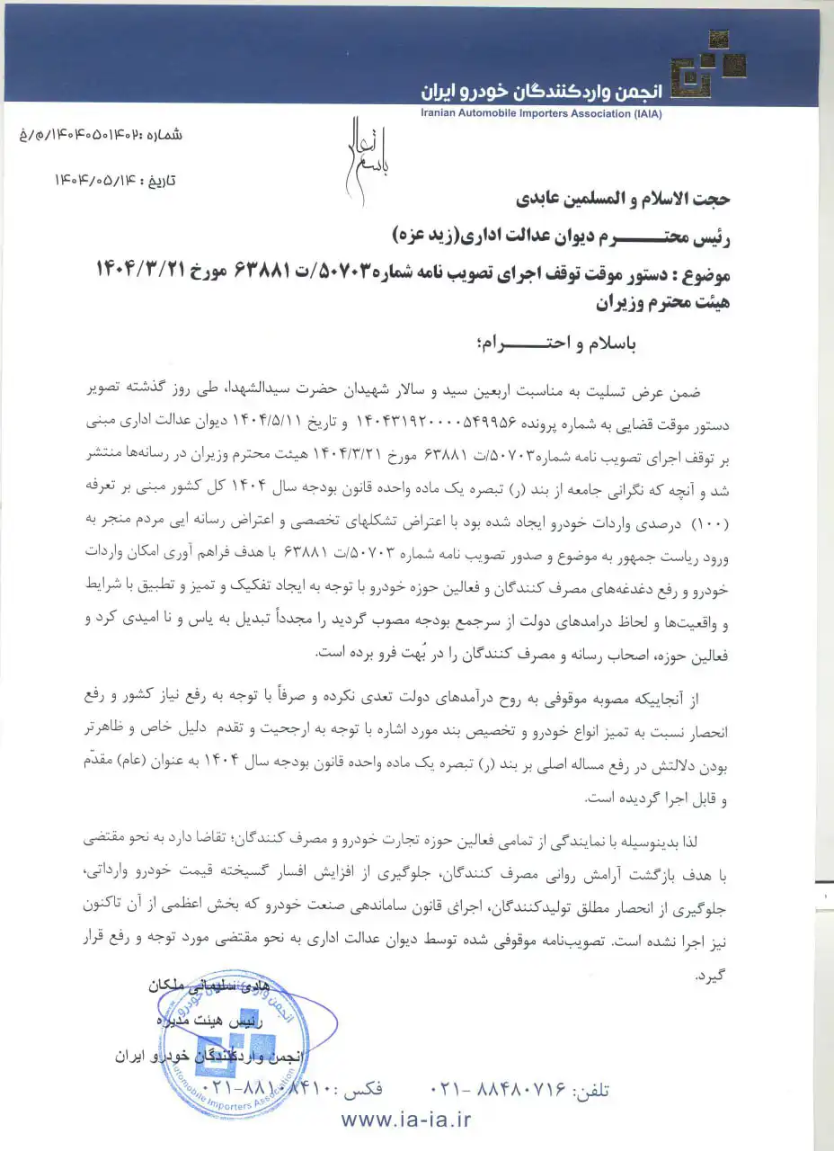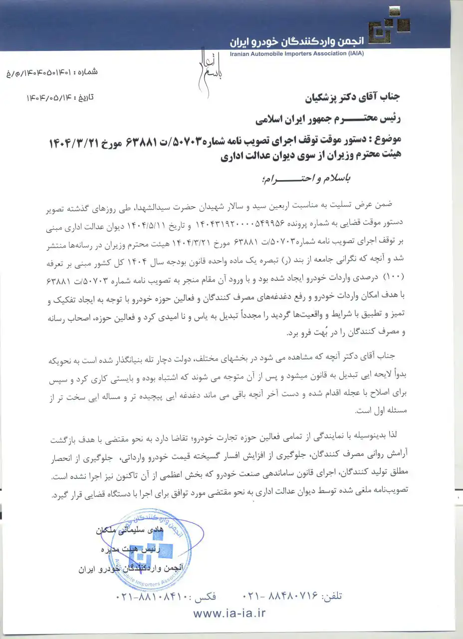 انجمن واردکنندگان خودرو ایران با ارسال دو نامه رسمی به رئیس‌جمهور و رئیس دیوان عدالت اداری، نسبت به مصوبه اخیر هیئت دولت مبنی بر اعمال تعرفه ۱۰۰ درصدی بر واردات خودرو واکنش نشان داده است. به دنبال اعتراض گسترده فعالان بازار و رسانه‌ها، دیوان عدالت اداری با صدور دستور موقت، اجرای این مصوبه را متوقف کرده است؛ مصوبه‌ای که ذیل بند (ز) تبصره یک ماده واحده قانون بودجه سال ۱۴۰۴ ابلاغ شده بود.