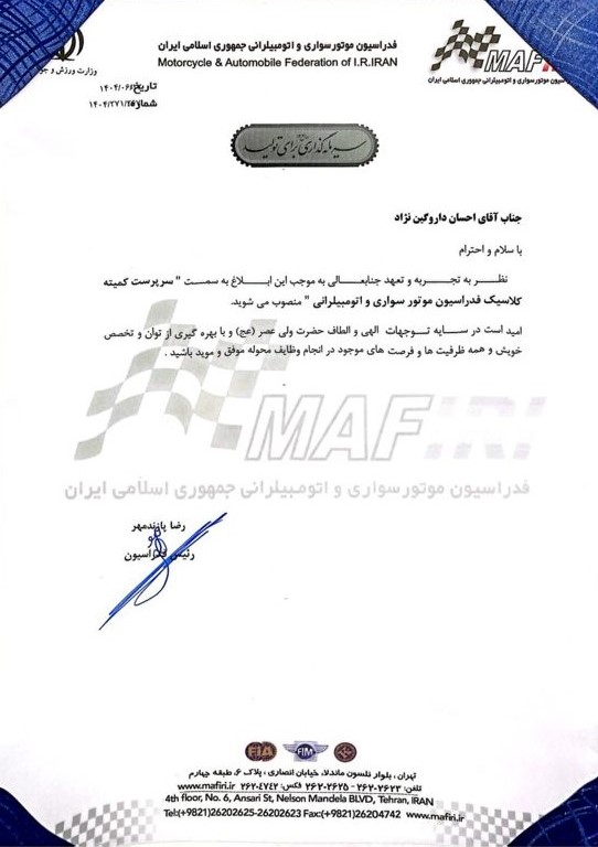 در متن این حکم آمده؛ جناب آقای احسان داروگین نژاد، نظر به تجربه و تعهد جنابعالی به موجب این ابلاغ به سمت سرپرست کمیته کلاسیک موتورسواری و اتومبیل رانی منصوب می شوید. امید است در سایه توجهات الهی و با بهره گیری از تجربه و تخصص خویش و همه ظرفیت ها و فرصت های موجود در انجام وظایف محوله موفق باشید.