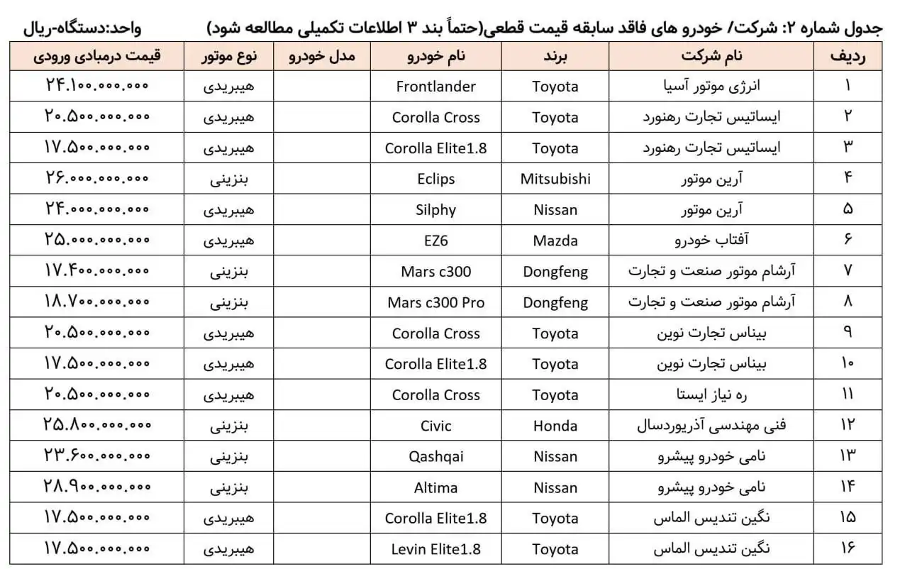 – در صورت انعقاد قرارداد به روش پیش‌فروش، حداکثر مبلغ قابل دریافت معادل پنجاه درصد قیمت فروش مندرج در جداول فوق بوده و قیمت فروش قطعی پس از ارائه اسناد و مدارک مثبته خودروهای وارداتی توسط سازمان حمایت مصرف‌کنندگان و تولیدکنندگان اعلام خواهد شد.