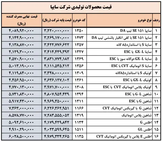 لیست قیمت جدید کارخانه ای محصولات سایپا _ خرداد ۱۴۰۴