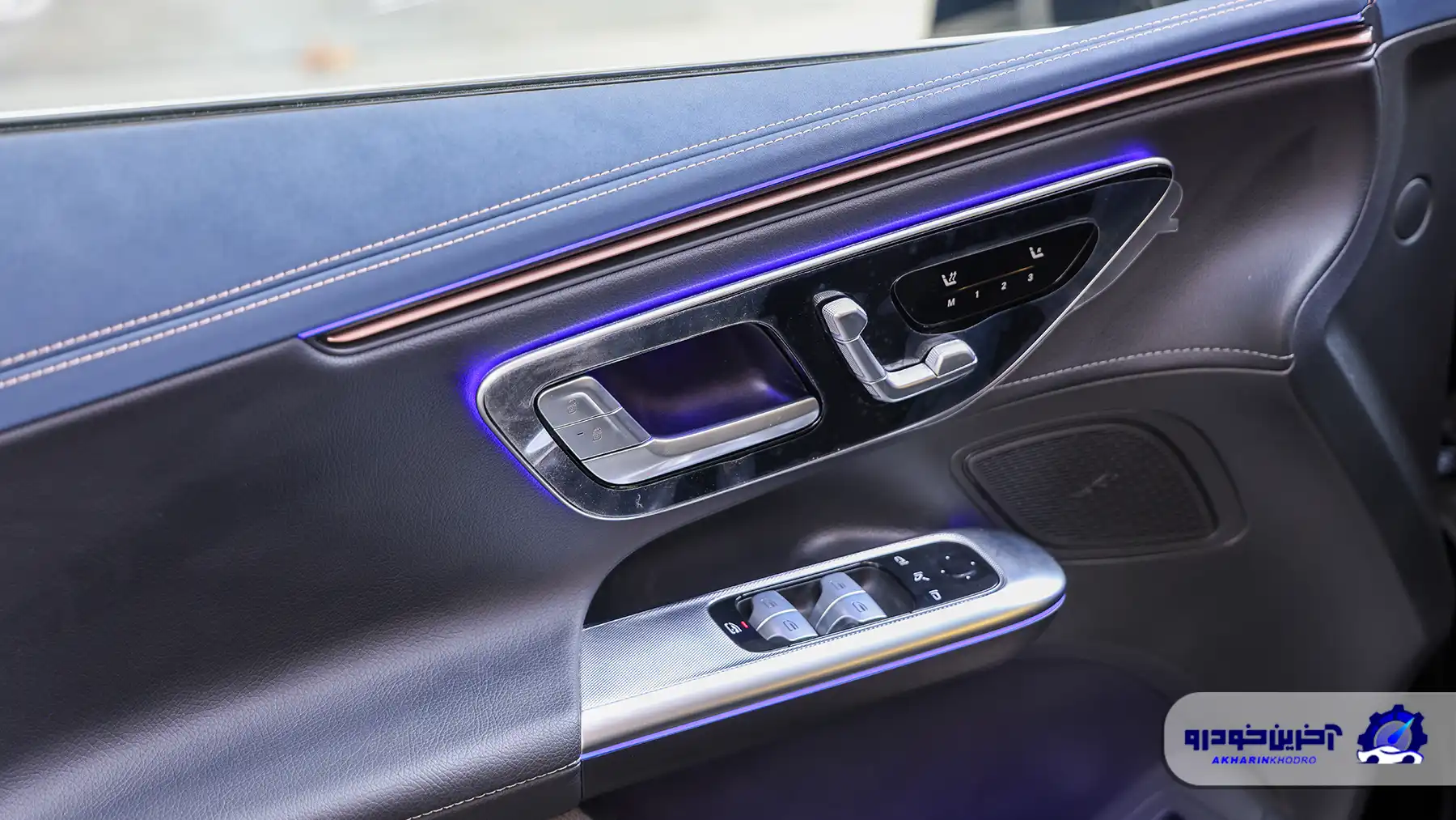 در داخل کابین همان سبک طراحی را می بینیم که قبل تر در پرچمداران سری EQ مثل EQE کراس اوور دیده بودیم. متریال به کار رفته در این خودرو بالاترین سطح کیفیت را دارند و نور پردازی را در تمام قسمت ها (صندلی، داشبورد و رودری ها) می بینیم. البته در نسخه ۵۰۰ خبری از هایپر اسکرین معروف مرسدس بنز نیست اما سطح قابل قبولی از امکانات را در این خودرو می بینیم. روی داشبورد از چوب استفاده شده که حس پرمیوم بودن را انتقال می دهد و تنظیمات مربوط به صندلی ها به سبک محصولات بنز، از روی درها انجام می شود. شیشه های جانی فریم لس طراحی شده اند و سقف پانورامیک دو تکه تا عقب خودرو کشیده شده است.