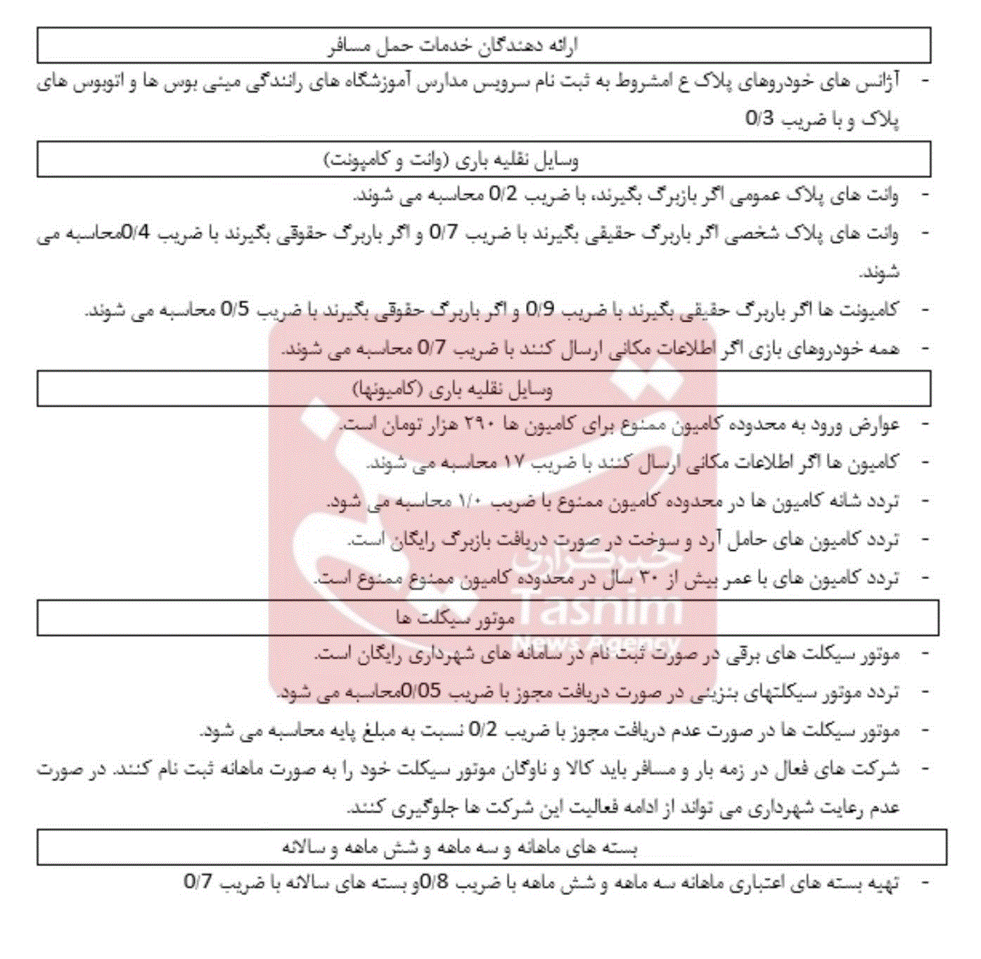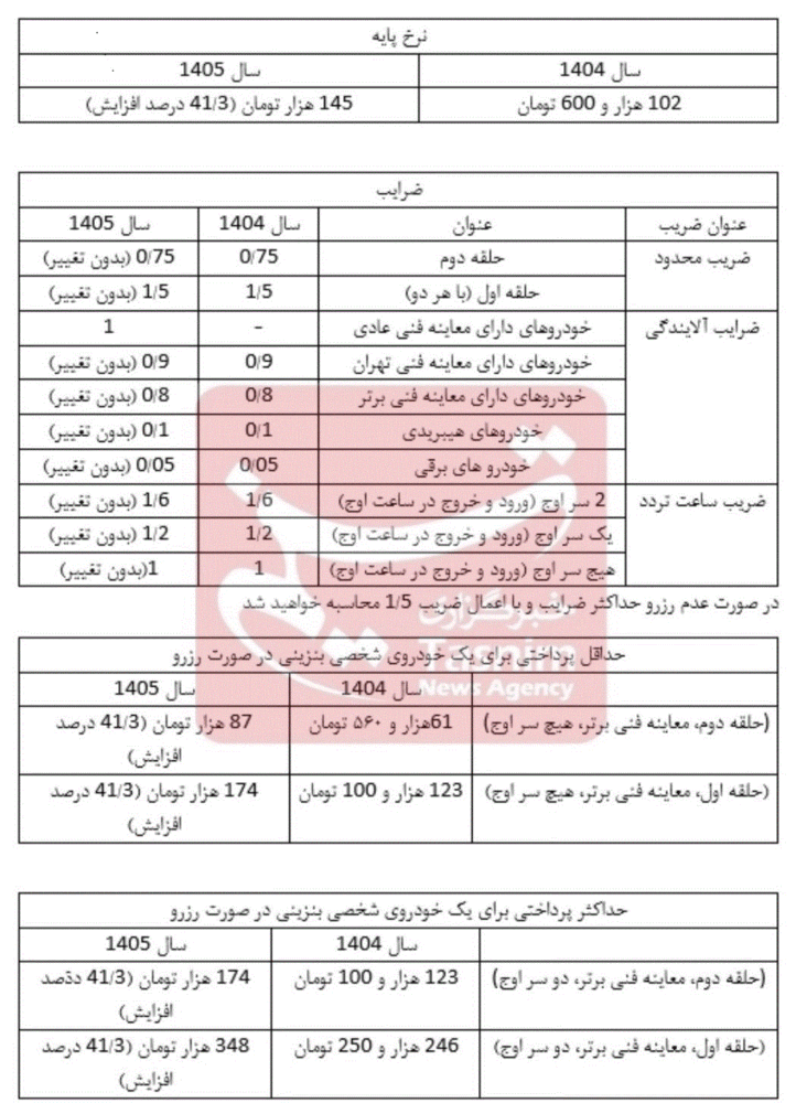 در جلسه اخیر شورا، اعضا ضمن بررسی پیشنهادهای ارائهشده از سوی شهرداری تهران، درباره تعرفههای جدید عوارض ورود به محدوده طرح ترافیک برای سال آینده و چارچوب اجرایی آن به بحث و تبادل نظر پرداختند. در نهایت، نرخها و مقررات پیشنهادی پس از اعمال اصلاحات لازم، به تصویب رسید. جزئیات مربوط به تعرفههای مصوب و ضوابط اجرایی، در جداول زیرا قابل مشاهده است.