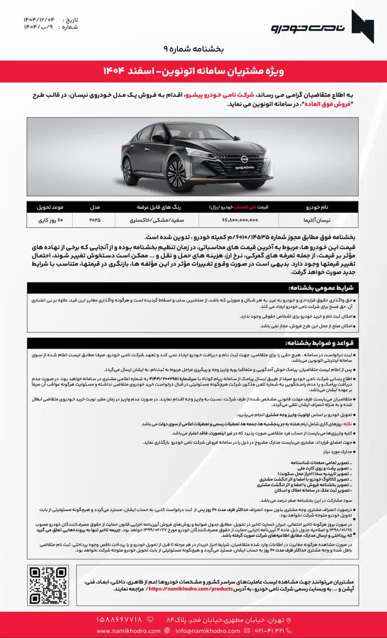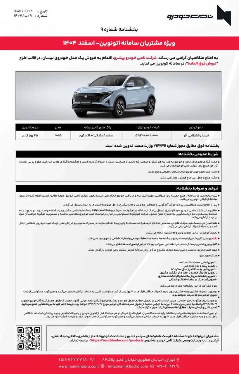 شرکت نامی خودرو سدان و کراس اوور نیسان را در سامانه اتونوین عرضه می کند؛ نیسان قشقایی و آلتمیا عرضه اسفند ۱۴۰۴ اتونوین.