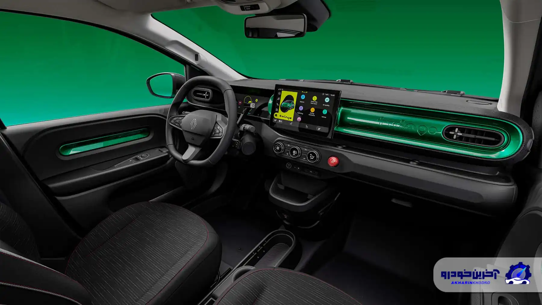 فضای داخلی رنو توئینگو جدید کمتر رنگ و بوی نوستالژیک دارد. به لطف نمایشگر دیجیتال ۷ اینچی برای پشت آمپر و نمایشگر مرکزی ۱۰ اینچی برای سیستم چندرسانهای، کابین این هاچبک برقی کاملاً مدرن به نظر میرسد. همانند نسل اول، بخشی از رنگ بدنه به داخل کابین نیز راه یافته تا حس هماهنگی بیشتری ایجاد کند. قسمت بالایی درهای جلو نیز جزئی از بدنه اصلی است و با رنگ بیرونی خودرو رنگآمیزی میشود؛ تصمیمی که هم در کاهش هزینه تولید و هم در ایجاد حس یکپارچگی مؤثر بوده است.