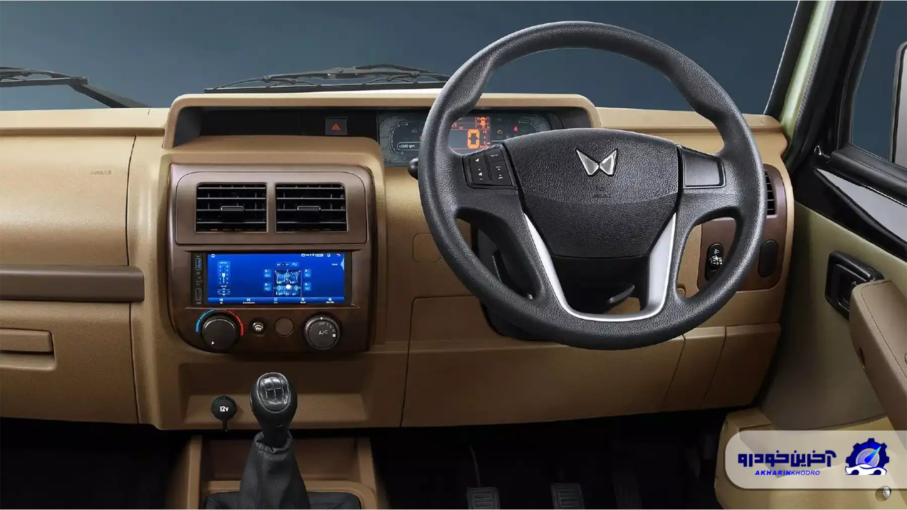 فضای داخلی ماهیندرا بولرو هنوز هم حال و هوای خودروهای دهه ۲۰۰۰ را دارد، اما تغییر اصلی این نسخه، اضافه شدن نمایشگر لمسی ۷ اینچی در قسمت میانی داشبورد است. این سیستم چندرسانهای ساده از بلوتوث پشتیبانی میکند، اما خبری از اپل کارپلی و اندروید اتو نیست. صفحه دیجیتال پشت فرمان حالا طراحی بروز تری دارد و فرمان مجهز به کلیدهای کنترل صوتی شده است.