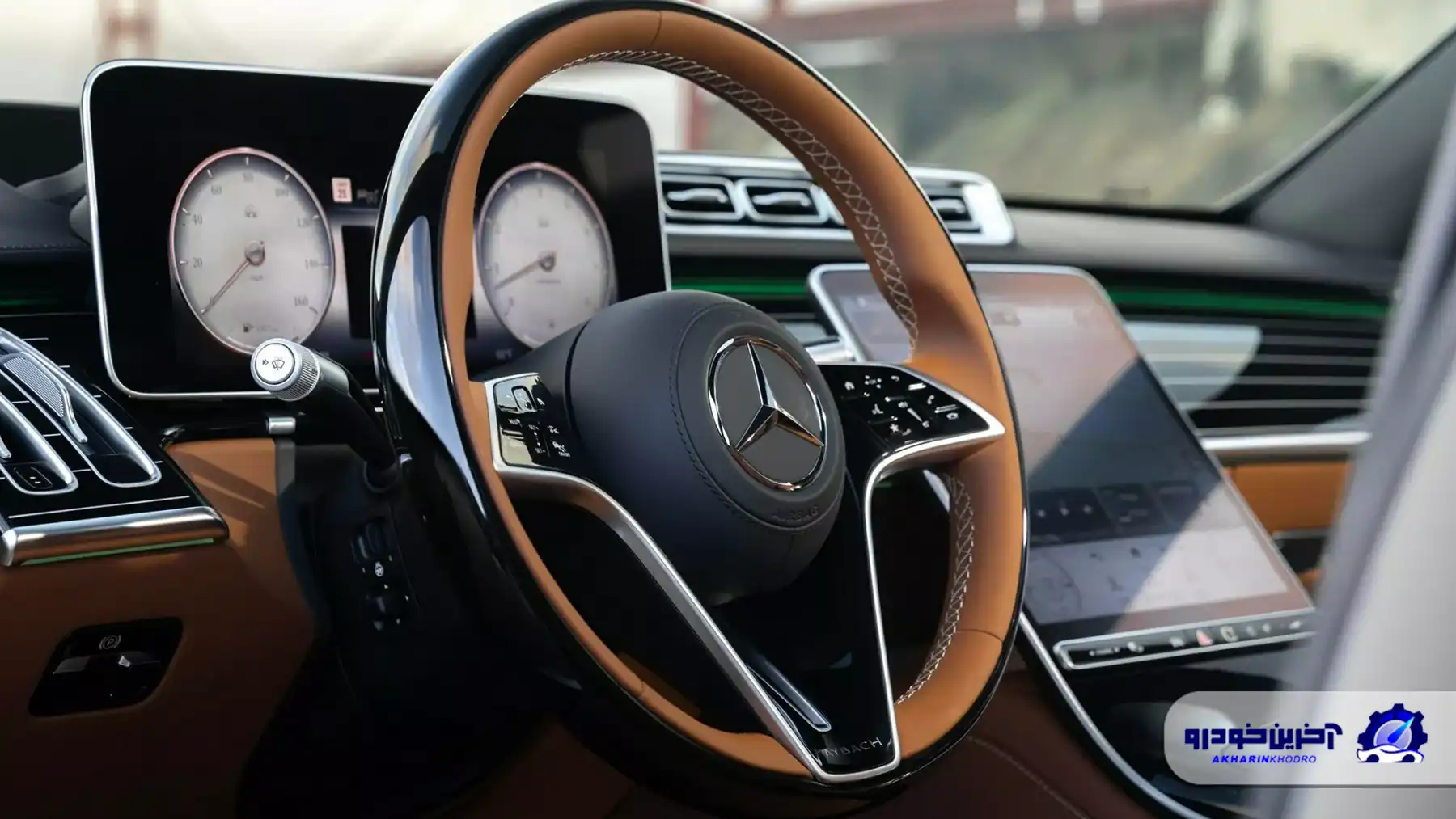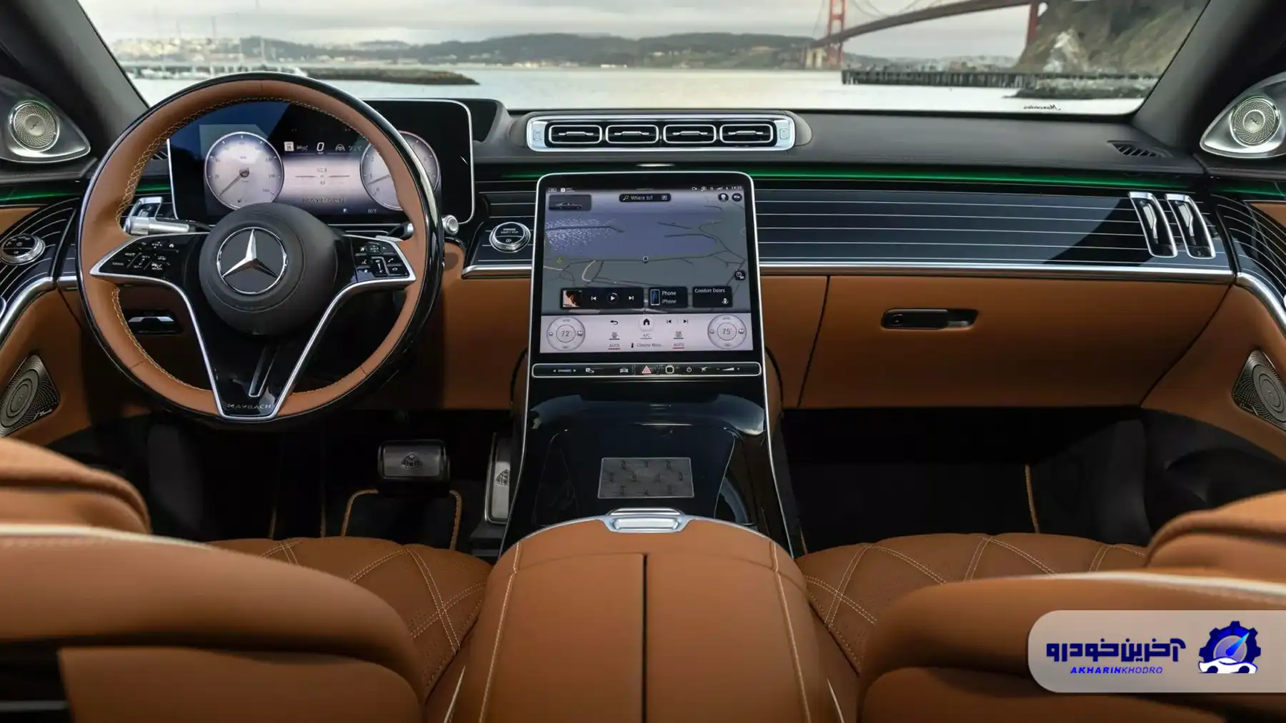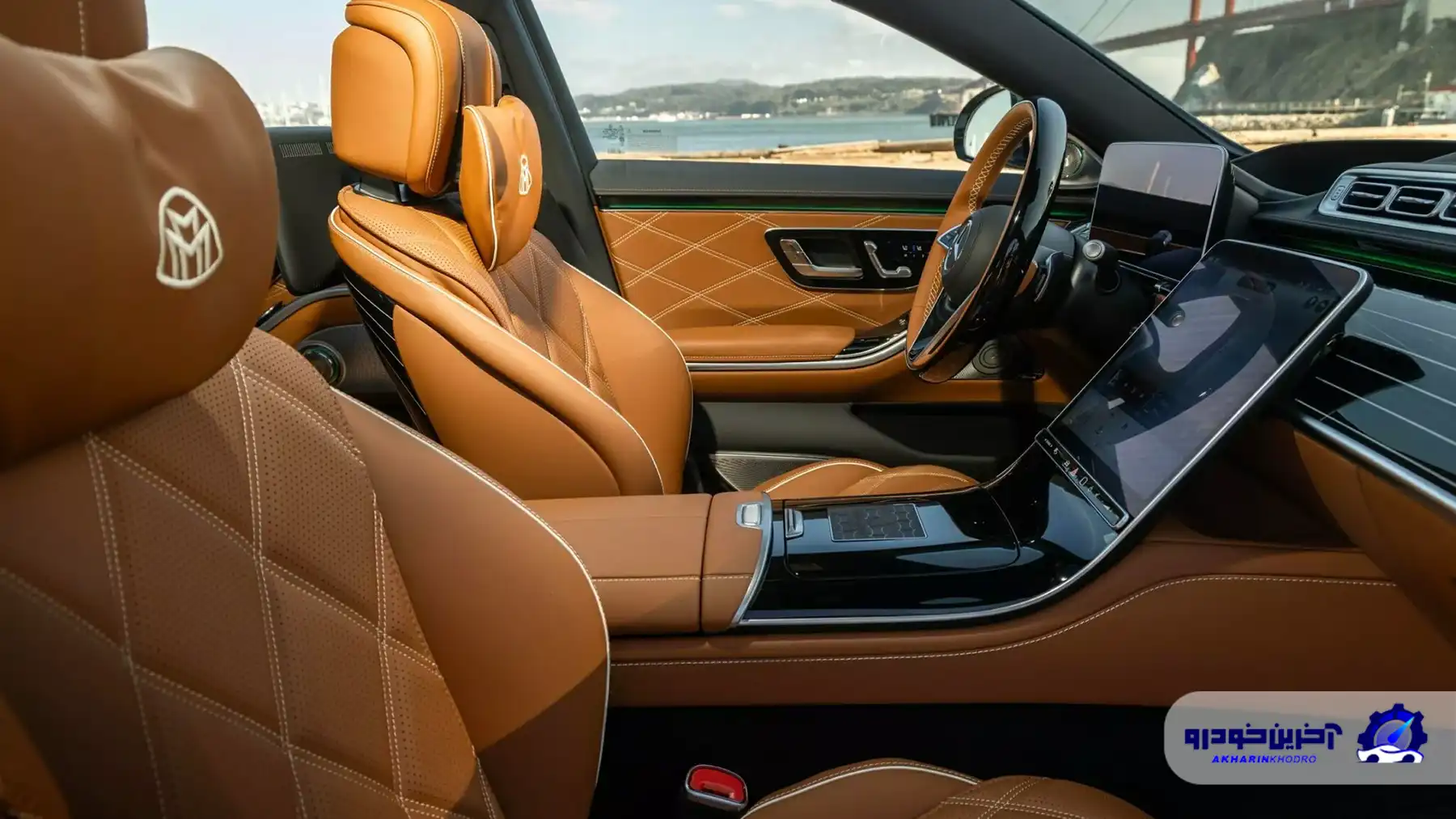 فضای داخلی مرسدس مایباخ S680 امرالد آیل ادیشن با چرم ناپای دستدوز قهوهای رنگ و سقف چرم ناپای مشکی با دوخت لوزی شکل، حس اصالت و شکوه را به اوج رسانده است. تریم داخلی با طرح مشکی پیانویی، صفحات ویژه روی رکاب درها و نشان اختصاصی Edition Emerald Isle روی کنسول مرکزی که با عدد تیراژ تولید ترکیب شده، حس تمایز این نسخه را دوچندان میکند. کفپوشهای مرغوب با حاشیه چرمی قهوهای روشن و لوگوی دوختهشده مایباخ، ظرافت بینظیری را به کابین اضافه کرده است.