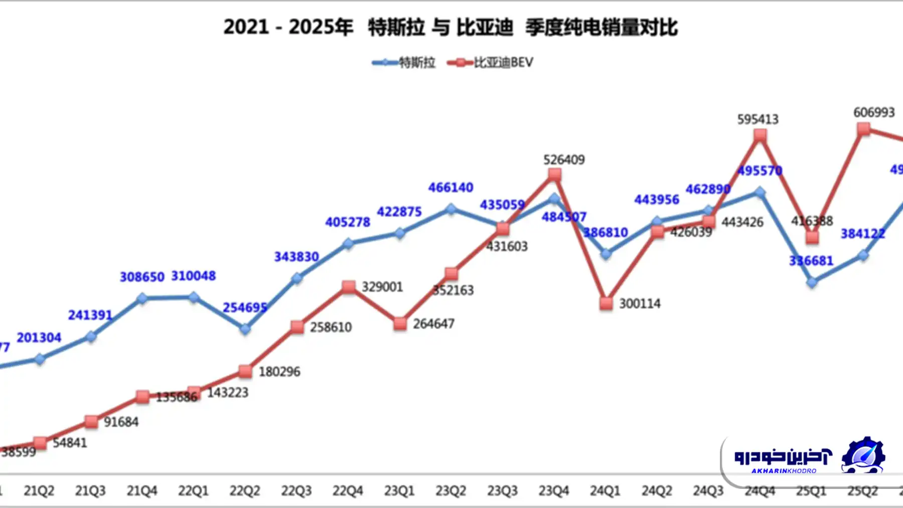 بازار جهانی خودروهای تمام برقی (BEV) روز به روز رقابتی تر میشود. طبق آمارهای جدید، بی وای دی توانسته جایگاه نخست را از چنگ تسلا خارج کند و با فاصله معنادار جلوتر از آن قرار بگیرد. بر اساس این دادهها، مجموع فروش جهانی خودروهای برقی بی وای دی تا پایان سه ماهه سوم سال ۲۰۲۵ به ۱ میلیون و ۶۰۵ هزار دستگاه رسیده؛ در حالی که تسلا در همین بازه زمانی موفق به فروش ۱ میلیون و ۲۱۷ هزار دستگاه شده است. به این ترتیب، بی وای دی با اختلافی در حدود ۳۸۸ هزار دستگاه از رقیب آمریکایی خود جلوتر ایستاده است.