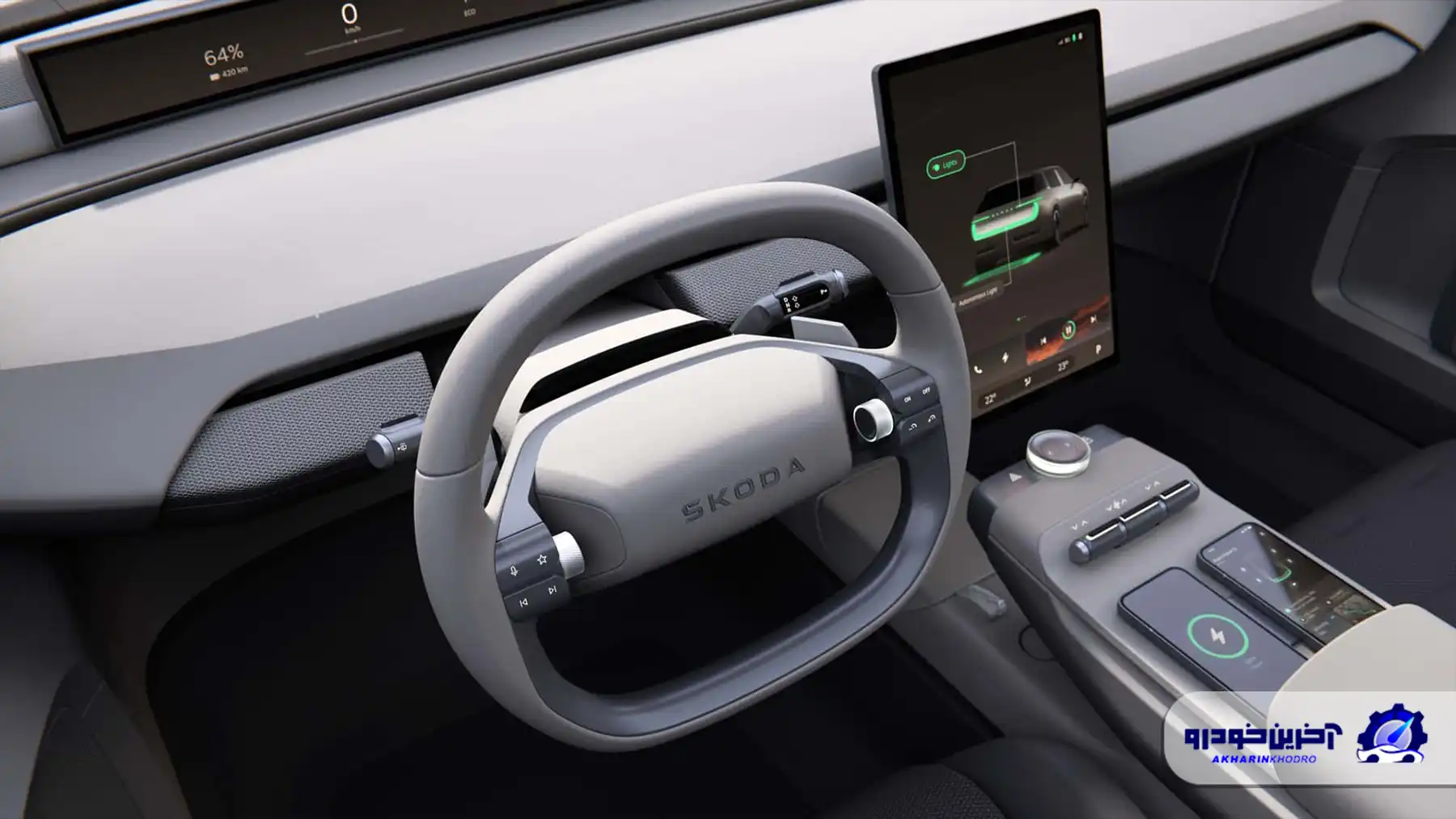 داخل کابین کانسپت اشکودا ویژن O تغییرات بنیادینی نسبت به محصولات کنونی کمپانی دیده می‌شود. شاخص‌ترین ویژگی این بخش را باید نمایشگر عریضی دانست که کل داشبورد را فرا گرفته؛ این نمایشگر اندازه‌ای برابر با ۴۷.۲ اینچ دارد و نسل جدید ب ام و iX3 را در ذهن تداعی می‌کند. البته باید به این نکته اشاره کنیم که در iX3 تصویر روی داشبورد انعکاس می‌یابد، اما در نمایشگر ویژن O تصویر واقعی روی صفحه نمایش داده می‌شود. یک نمایشگر عمودی بزرگ نیز در بخش میانی قرار گرفته است.