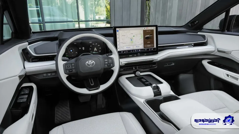 در فضای داخلی تویوتا هایلندر برقی با طراحی چند لایه و پیچیدهای روبرو هستیم. داشبورد این شاسی بلند سه ردیفه شامل انواع خطوط و حجمپردازیهای مختلف است. در قسمت میانی داشبورد از یک نمایشگر مرکزی ۱۴ اینچی استفاده شده که از اپل کارپلی و اندروید اتو به صورت بیسیم پشتیبانی میکند. پشت فرمان نیز نمایشگر دیجیتال ۱۲.۳ اینچی اطلاعات لازم را در اختیار راننده قرار میدهد. جالب اینکه این نمایشگر قابلیت نمایش نقشه به طور تمام صفحه را دارد.