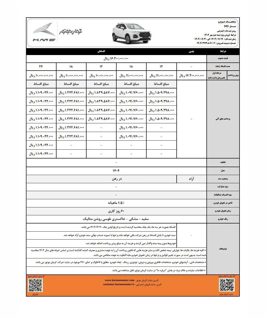 شرایط فروش نقد و اقساط کی ام سی SR3 – مهر ۱۴۰۴