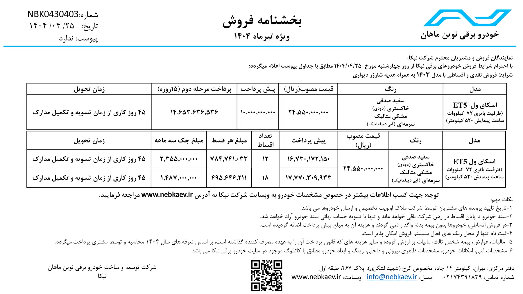 اسکای ول ET5 نخستین کراس اوور مونتاژی برقی بازار ایران است که توسط شرکت نوین ماهان تحت نشان نبکا به عرضه می رسد. حالا بخشنامه فروش نقد و اقساط این کراس اوور منتشر شده و متقاضیان می توانند برای خرید این خودرو اقدام کنند. اینکراس اوور با مدل ۱۴۰۳ عرضه می شود و برای هر خودرو یک شارژر دیواری به عنوان هدیه تقدیم به مشتریان می شود. قیمت مصوب این خودرو ۲ میلیارد و ۴۵۵ میلیون تومان در نظر گرفته شده که در روش نقدی پرداخت دو مرحله ای را داریم و در روش اقساطی، قسط های ۱۲ و ۱۸ ماهه برای پرداخت در نظر گرفته شده است. جزئیات این شرایط فروش در جدول زیر قابل مطالعه است :