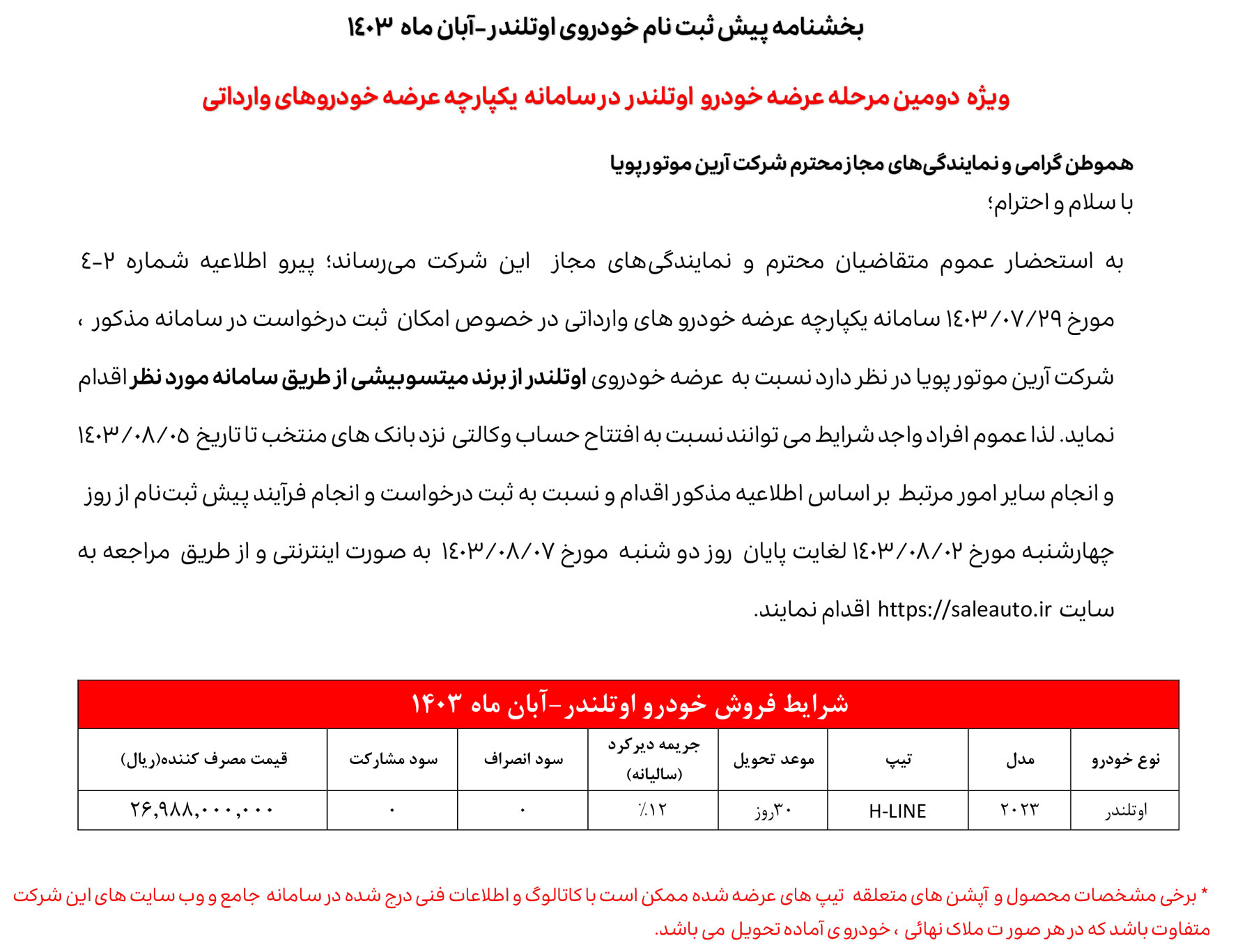 در فروش پیش رو قیمت اوتلندر جدید ۲ میلیارد و ۶۹۸ میلیون و ۸۰۰ هزار تومان در نظر گرفته شده است و موعد تحویل هم ۳۰ روزه محاسبه می شود. مدل خودروهای این عرضه ۲۰۲۳ خواهد بود و سود تاخیر ۱۲ درصد بصورت سالیانه محاسبه می شود.