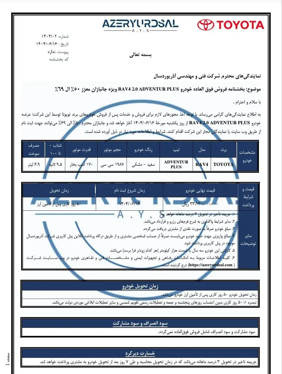 شرکت آذر یوردسال شرایط فروش کراس اوور ژاپنی خود را ویژه جانبازان معزز برای شهریور ماه ۱۴۰۴ اعلام کرد. در این شرایط فروش کراس اوور ژاپنی تویوتا راو ۴ به صورت فروش فوری عرضه می شود. طرح فروش شرکت آذر یوردسال ویژه سامانه خودرو های جانبازان است و جانبازان ۵۰ الی ۶۹ درصد می توانند در آن ثبتنام کنند. در این شرایط فروش قیمت قطعی ۳,۳۱۳,۰۰۰,۰۰۰ تومان برای راو ۴ ادونچر پلاس اعلام شد و موعد تحویل ۵۰ روز کاری می باشد. جریمه تاخیر ۳ درصدی این شرکت ۵۰ روزکاری پس از تامین ارز به مشتری تعلق می گیرد. نسل پنجم تویوتا راو۴ که همان نسخه ای است که در شرکت آذر یوردسال عرضه می کند در نمایشگاه خودرو نیویورک ۲۰۱۸ برای نخستین بار به نمایش عمومی گذاشته شد. تویوتا راو۴ سری XA50 روی پلتفرم TNGA-K توسعه پیدا کرده و در نسخه های فیس لیفت وارد بازار ایران می شود. متقاضیان این خودرو می توانند جهت ثبت نام از تاریخ ۱۶ شهریور به نمایندگی های شرکت آذر یوردسال یا وبسایت آن مراجعه نمایند.