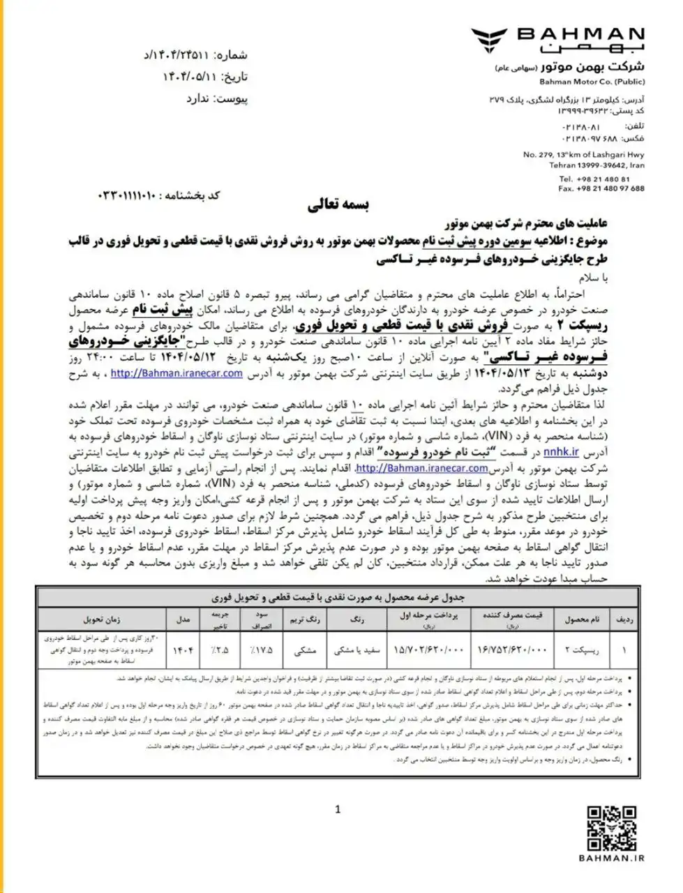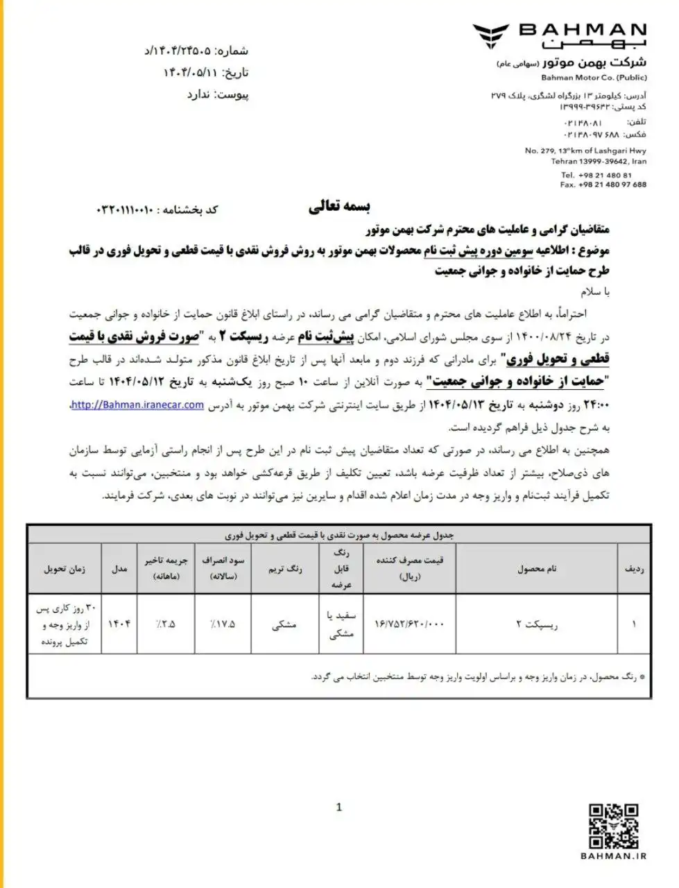 One Response to “شرایط فروش سدان بهمن موتور ریسپکت ۲ اعلام شد – مرداد ۱۴۰۴”