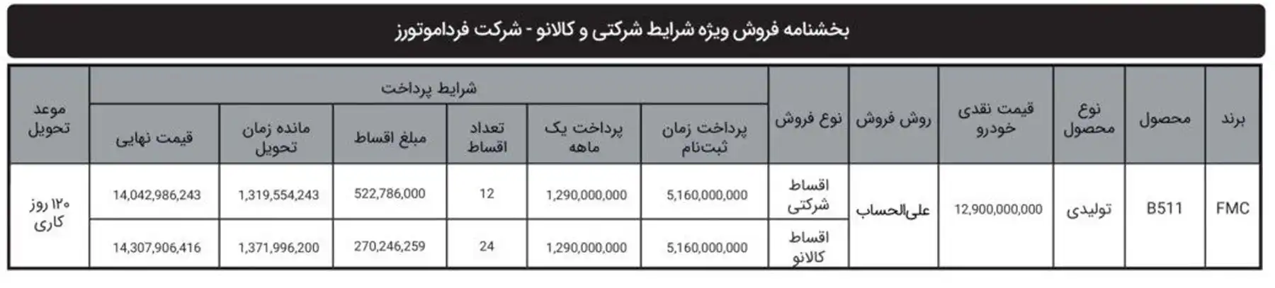 بر اساس شرایط فروش منتشر شده، سدان FMC 511 با قیمت یک میلیارد و ۲۹۰ میلیون تومان به فروش می رسد. این در حالی است که قیمت این خودرو پیش از این ۱ میلیارد و ۱۹۰ میلیون تومان بوده و این یعنی افزایش قیمت ۱۰۰ میلیون تومانی را برای این سدان مونتاژی شاهد هستیم. بر اساس جدیدترین بخشنامه فروش فرداموتورز، این سدان در قالب فروش اقساطی ۱۲ و ۲۴ ماهه به فروش می رسد و موعد تحویل خودروها هم ۱۲۰ روز کاری اعلام شده است. جزئیات این شرایط فروش در جدول زیر قابل مطالعه است :