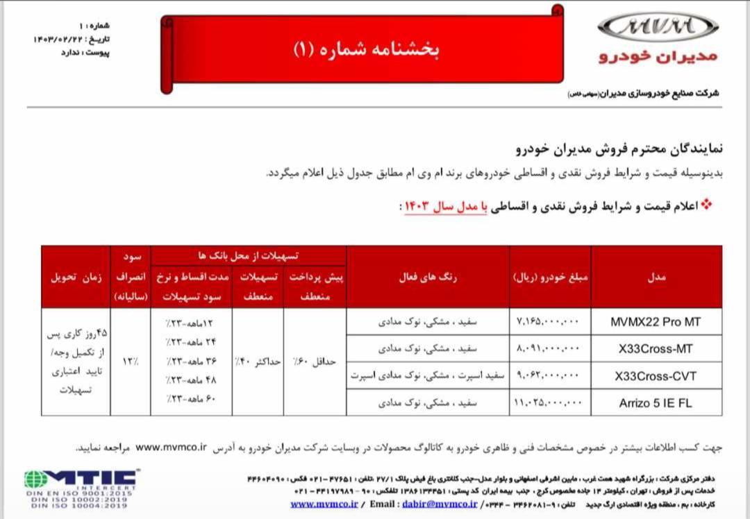 بر اساس بخشنامه شرکت مدیران خودرو فروش محصولات ام وی ام این شرکت با قیمت علی الحساب ویژه اردیبهشت ماه از روز دوشنبه آغاز خواهد شد. متقاضیان می توانند جهت ثبت نام به نمایندگی های مدیران خودرو مراجعه نمایند. در این شرایط فروش ام وی ام X22 پرو دنده ای، ام وی ام X33 کراس دنده ای، ام وی ام X33 کراس اتوماتیک و ام وی ام آریزو ۵ اسپرت FL به صورت نقدی و اقساطی عرضه می شوند. مدیران خودرو اعلام شده است که این خودروها با مدل ۱۴۰۳ به فروش می رسند و موعد تحویل این خودروهای ام وی ام ۴۵ روز کاری پس از تکمیل وجه و مدارک خواهد بود.