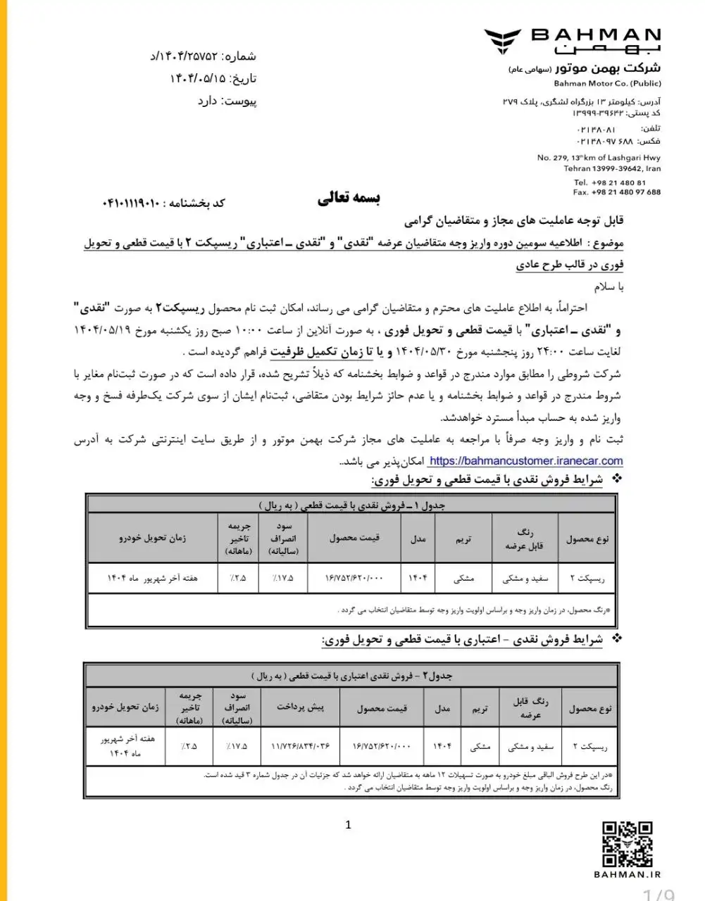 شرکت بهمن موتور شرایط فروش سدان خود را برای متقاضیان عادی ویژه مرداد ماه ۱۴۰۴ اعلام کرد. در این شرایط فروش سدان بهمن موتور ریسپکت ۲ به صورت فروش فوری و پرداخت نقدی و اقساط ویژه متقاضیان عادی عرضه خواهد شد. زمان تحویل در نظر گرفته شده برای این خودرو ۳۰ روز کاری بعد از تکمیل پرونده و پرداخت وجه خودرو است و در هفته آخر شهریور ماه به مشتیریان تحویل داده خواهد شد. بهمن موتور دو رنگ سفید و مشکی ریسپکت دو را عرضه می کند. متقاضیانی که قصد ثبت نام این خودرو را دارند می توانند از ساعت ۱۰ روز یک شنبه ۱۹ مرداد ماه تا پایان روز ۳۰ مرداد نسبت به پیش ثبت نام این خودرو در سایت بهمن موتور اقدام نمایند. سود تاخیر در نظر گرفته شده برای این خودرو ۲.۵ درصد به ازاء هر ماه است.
