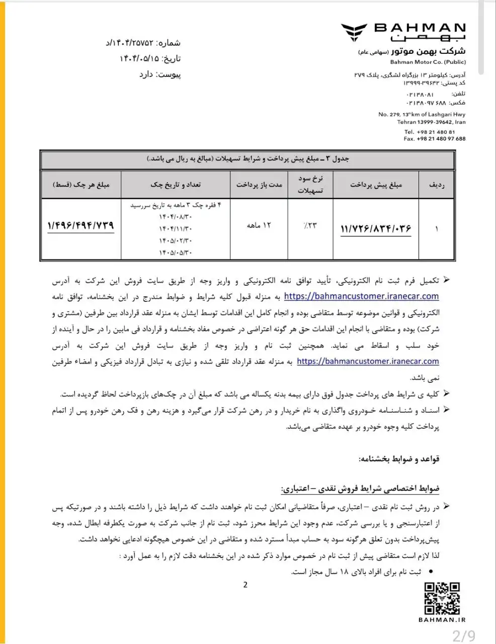 شرکت بهمن موتور شرایط فروش سدان ریسپکت ۲ را برای متقاضیان طرح عادی ویژه مرداد ماه ۱۴۰۴ به صورت نقد و اقساط اعلام کرد.