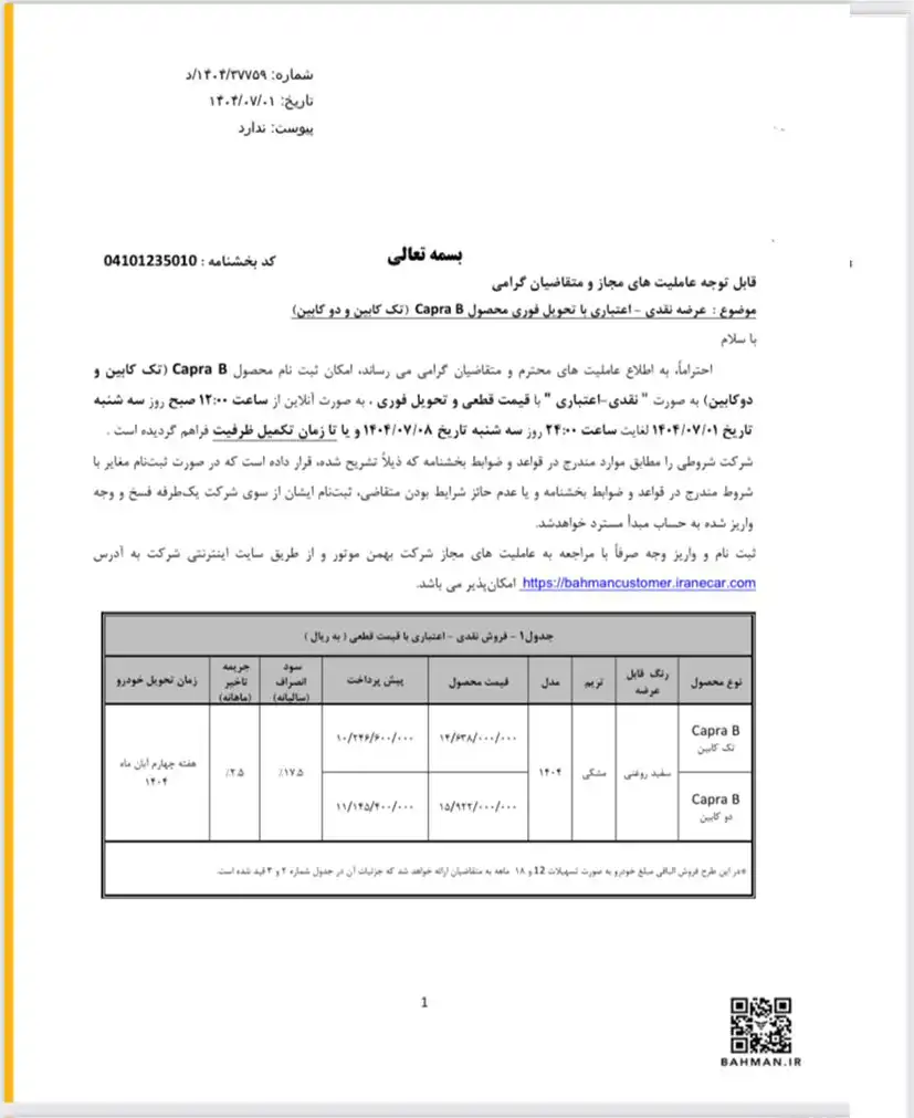 شرکت بهمن موتور شرایط فروش وانت و پیکاپ خود را در تیپ B برای مهر ماه ۱۴۰۴ را اعلام کرد. در این شرایط فروش کاپرا B تک و دوکابین به صورت نقد و اقساط عرضه می شود. زمان تحویل اعلامی برای این کاپرا B در هردو شرایط فروش برای هفته چهارم آبان ماه است و در صورت تاخیر در تحویل این خودروها سود تاخیر ۲.۵ درصدی به صورت ماهانه به مشتری تعلق می گیرد. سود انصراف در این طرح فروش۱۷.۵ درصد سالیانه می باشد. قیمت اعلامی برای نسخه تک کابین ۱,۴۶۳,۸۰۰,۰۰۰ تومان و نسخه دوکابین ۱,۵۹۲,۲۰۰,۰۰۰ تومان است. پیکاپ کاپرا یکی از محصولات کار و تجاری گروه بهمن است که از اواخر دهه ۸۰ ، روی خط تولید بهمن موتور حضور دارد. این پیکاپ در حقیقت ، محصول خودروسازی ZX Auto چین بوده و گروه بهمن تاکنون نسخه های تک و دو کابین و تک و دو دیفرانسیل را روانه بازار کرده و امروزه این خودرو جزو ارزانترین پیکاپ های بازار ایران محسوب می شود. نسخه ای جدید از این پیکاپ را با نام کاپرا B روانه بازار می شود. بهمن موتور مدت زمان اقساط ۱۸ تا ۲۴ ماه را برای این خودرو در نظر گرفته است. متقاضیان می توانند از ساعت ۱۲ روز سه شنبه ۱ مهر تا پایان روز سهشنبه ۸ مهرماه در سایت بهمن موتور نسبت به ثبتنام اقدام نمایند.