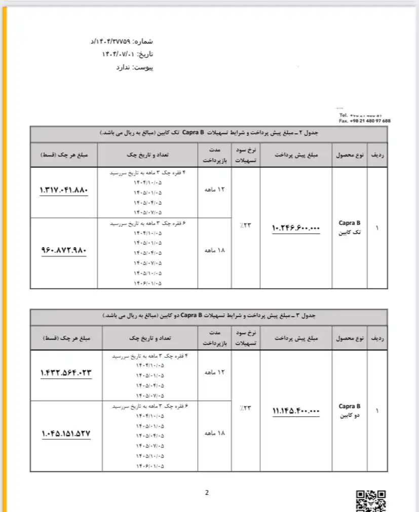 | کاپرا B-دوکابین | نقد- اقساط | ۱,۱۱۴,۵۴۰,۰۰۰ | ۱,۵۹۲,۲۰۰,۰۰۰ | هفته چهارم-آبان |