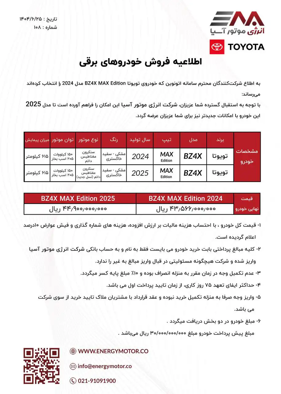 شرایط فروش و قیمت کراس اوور الکتریکی تویوتا ویژه متقاضیان سامانه اتونوین برای مهر ۱۴۰۴ اعلام شد. برندگان تویوتا BZ4X می توانند از امروز ۸ مهر ما تا یک شنبه ۱۳ مهرماه می توانند نسبت به تکمیل ثبت نام و پرداخت وجه خودرو با مراجعه به سایت شرکت انرژی موتور آسیا اقدام نمایند؛ انرژی موتور آسیا شرکت وارد کننده تویوتا بی زد ۴ ایکس است و محصول برقی خود را در پلتفرم اتونوین عرضه می کند. انرژی موتور آسیا کراس اوور الکتریکی تویوتا را در مدل سال ۲۰۲۴ و ۲۰۲۵ وارد کرد است. قیمت تویوتا BZ4X مدل ۲۰۲۴ و ۲۰۲۵ با احتساب کلیه هزینه های جانبی به ویژه مهر ماه ۴,۳۵۶,۶۰۰,۰۰۰ و ۴,۴۴۹,۰۰۰,۰۰۰ تومان است.