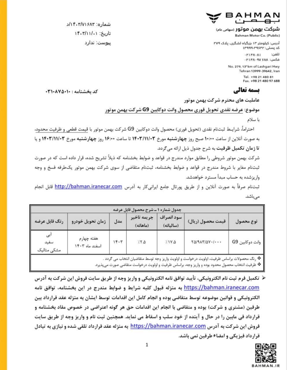 به گزارش پایگاه خبری آخرین خودرو، بهمن G9 به عنوان جدیدترین پیکاپ گروه بهمن قرار است با قیمت قطعی ۲۵,۹۸۳,۵۷۰,۰۰۰ ریال به فروش برسد و بر اساس بخشنامه شرکت بهمن موتور، موعد تحویل این خودرو هفته چهارم اسفندماه ۱۴۰۳ خواهد بود. لازم به ذکر است که در این طرح سود انصراف سالیانه ۱۷.۵ درصد اعلام شده و جریمه تاخیر ماهانه ۲.۵ درصد خواهد بود.