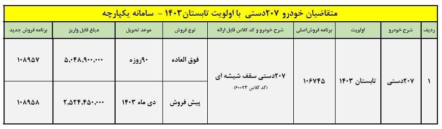 شرایط انتخاب و واریز وجه مجدد به تعداد محدود برای بخشی از متقاضیان طرح پیش فروش پژو ۲۰۷ دستی با اولویت تابستان ۱۴۰۳ سامانه یکپارچه مطابق جدول پیوست ایجاد شده است. متقاضیان فوق می‌توانند طی مدت ۱۰ روز یا زمان تکمیل ظرفیت با مراجعه به سایت فروش اینترنتی ایران خودرو نسبت به ثبت نام اقدام نمایند.