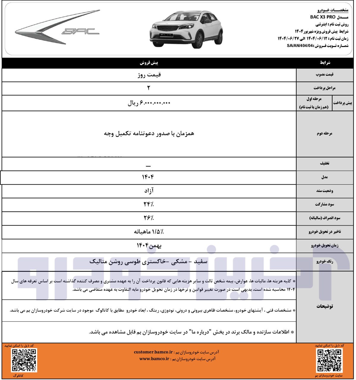 در این شرایط فروش کراس اوور بک X3 پرو به صورت پیش فروش عرضه می شود. قیمت اعلامی کرمان موتور در این پیش فروش به این گونه است که مشتری باید ۶۰۰ میلیون تومان آن را به صورت پیش پرداخت, پرداخت کند و الباقی همزمان با صدور دعوت نامه تکمیل وجه (به قیمت روز) در بهمن ۱۴۰۴پرداخت میشود و به ازای هر ماه تاخیر سود ۱.۵ درصدی (ماهانه) به مشتری تعلق خواهد گرفت. بک X3 پرو خودرویی اقتصادی و در کلاس کراس اوور های کوچک است و برای اولین بار توسط کمپانی چینی جیلی تولید و با نام میپل X3 پرو به روانه بازار چین شده است. متقاضیان می توانند از چهارشنبه ۱۲ شهریور لغایت روز چهارشنبه ۲۷ شهریور با مراجعه به سایت فروش شرکت خودروسازان بم نسبت به ثبت نام اقدام نمایند
