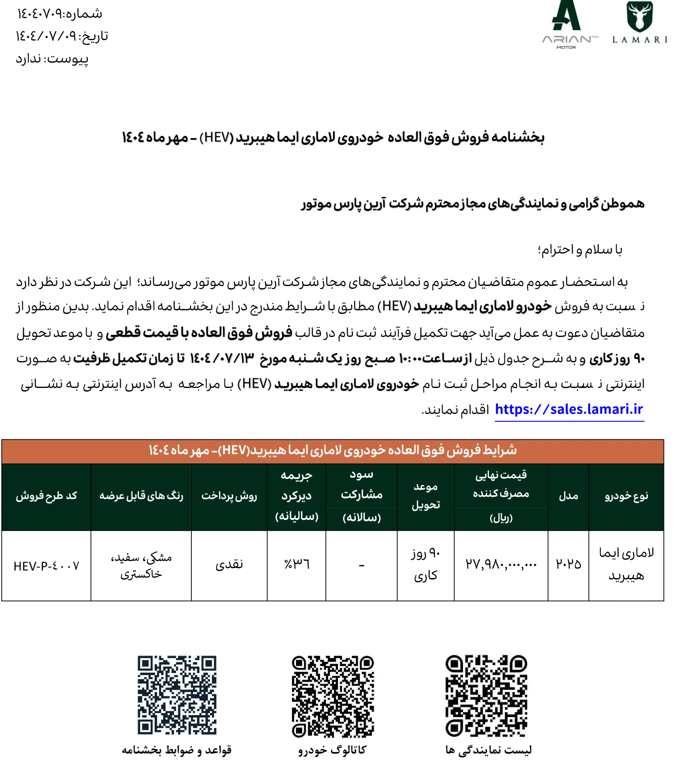 به گزارش پایگاه خبری آخرین خودرو، لاماری ایما هیبرید در این طرح قرار است ظرف مدت ۹۰ روز کاری به متقاضیان تحویل داده شود و جریمه دیرکرد سالیانه آن ۳۶ درصد اعلام شده است. متقاضیانی که قصد دارند در شرایط فروش ویژه لاماری ایما هیبرید شرکت کنند می بایست از ساعت ۱۰ روز یکشنبه ۱۳ مهر ۱۴۰۴ لغایت روز پنجشنبه ۱۷ مهر ۱۴۰۴ و یا تا زمان تکمیل ظرفیت نسبت به ثبت نام و شرکت در این شرایط فروش ویژه لاماری ایما هیبرید اقدام نمایند.