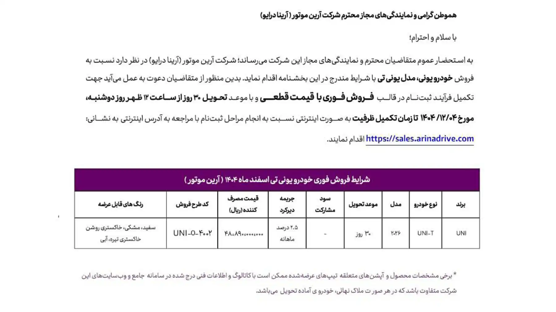 عرضه این خودرو با موعد تحویل ۳۰ روزه انجام می شود و تمامی خودروها مدل ۲۰۲۶ هستند. متقاضیان برای ثبت نام می توانند از ساعت ۱۲ ظهر روز دوشنبه مورخ ۴ اسفند تا زمان تکمیل ظرفیت به سایت فروش آرینا درایو مراجعه کنند. جزئیات بیشتر از این شرایط فروش در جدول زیر قابل مطالعه است :