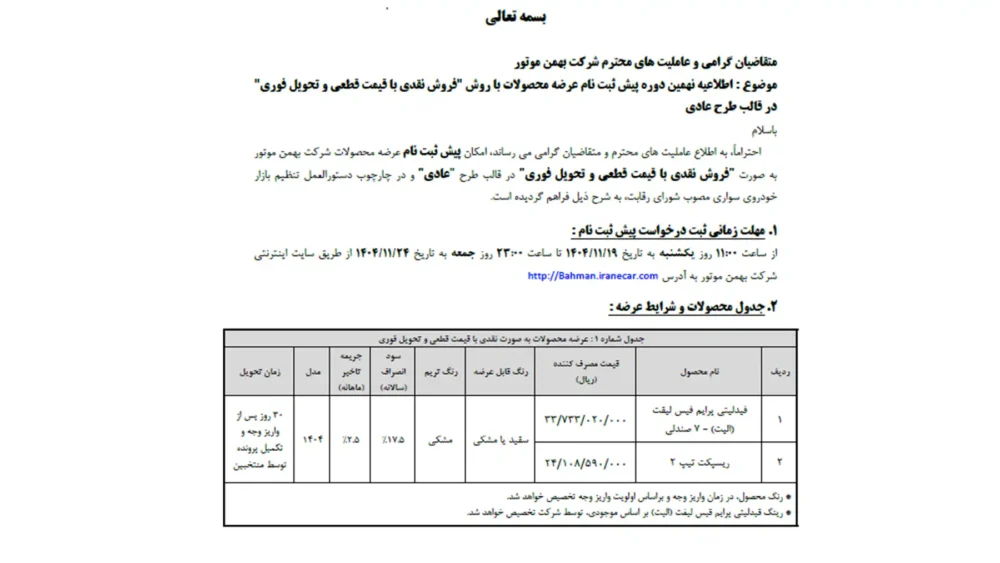 چند روز قبل بود که افزایش قیمت شدیدی برای محصولات بهمن موتور اعلام شده بود که البته بعد به صورت رسمی تکذیب گردید. حالا این شرکت اطلاعیه نهمین دوره پیش ثبت نام دو محصول خود را با روش فروش نقدی با تحویل فوری منتشر کرده که همراه با آن قیمت جدید این دو محصول خم مشخص شده است. در این شرایط فروش دو خودرو فیدلیتی الیت 7 نفره و ریسپکت ۲ برای متقاضیان جایگزینی خودروهای فرسوده، عادی و جوانی جمعیت به عرضه می رسند و متقاضیان می توانند از ساعت ۱۱ روز یکشنبه به تاریخ ۱۹ بهمن تا ساعت ۲۳ روز جمعه به تاریخ ۲۴ بهمن از طریق سایت اینترنتی شرکت بهمن موتور اقدام به ثبت نام کنند.