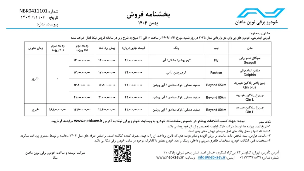 شرکت نوین ماهان یا همان نبکا مدت ها بود که روی معرفی نشان بی وای دی و محصولات آن کار می کرد و حالا نخستین شرایط فروش BYD های وارداتی این شرکت منتشر شده است. بر اساس شرایط فروش منتشر شده، چهار خودروی بی وای دی سیگال تمام برقی ، بی وای دی دلفین تمام برقی، بی وای دی چین پلاس پلاگین هیبرید و بی وای دی چین L پلاگین هیبرید به عرضه می رسند. متقاضیان می توانند برای خرید این خودروها با مدل ۲۰۲۵ از ساعت ۱۰ الی ۱۲ صبح روز شنبه ۱۱ بهمن ماه نسبت به ثبت نام در سایت فروش نبکا اقدام نمایند. اطلاعات بیشتر در مورد نحوه پرداخت و موعد تحویل این خودروها در جدول زیر قابل مطالعه است :