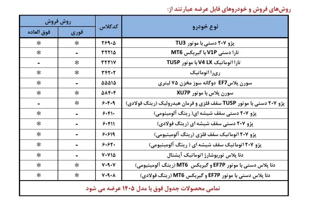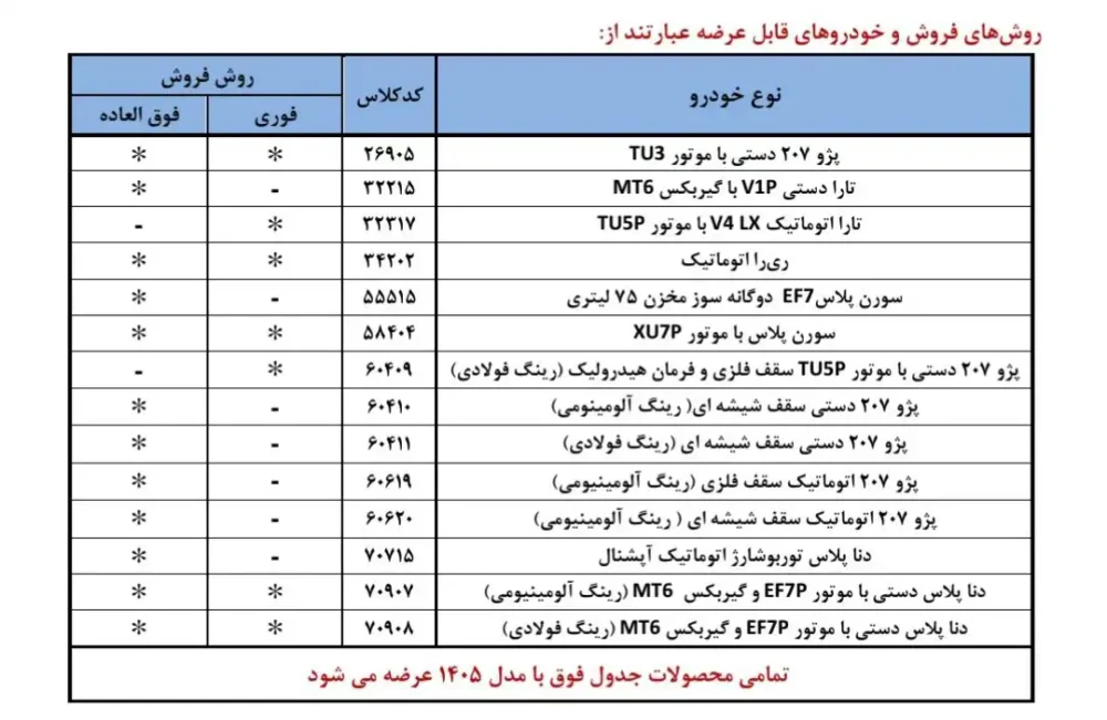 ۲- تمامی خودروها با مدل ۱۴۰۵ عرضه می شوند و در زمان ثبت نام هر متقاضی فقط می تواند یک خودرو انتخاب کند.