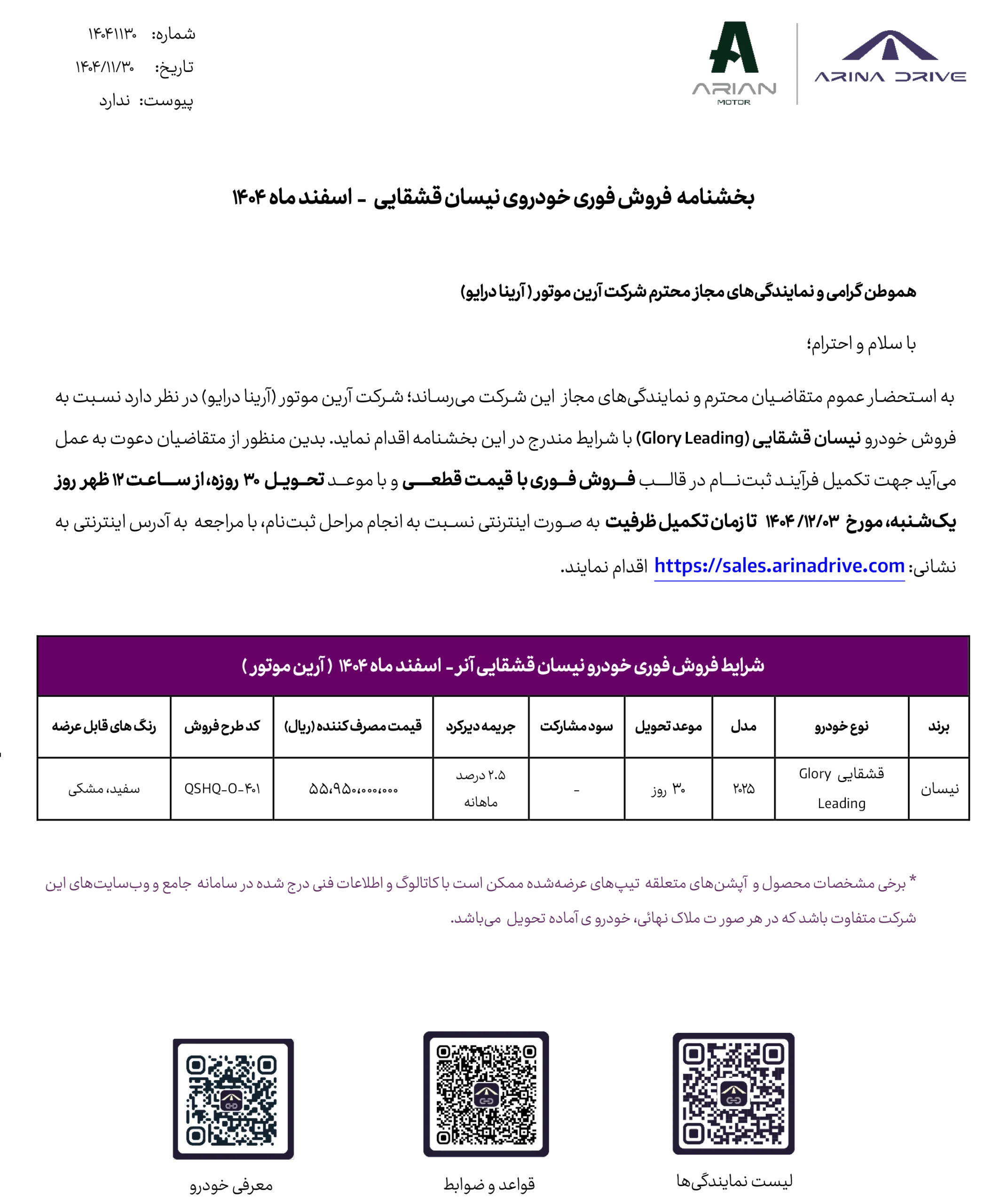 همچنین متقاضیان عزیز برای شرکت در شرایط فروش فوری نیسان قشقایی آنر می توانید به نمایندگی ۱۰۰۳ آرینا درایو (تلاش خودرو ایرانیان) را مراجعه کنید و از مزایای این نمایندگی برتر بهره مند شوند. همچنین شما عزیزان می توانید در هنگام ثبت نام اینترنتی نمایندگی تلاش خودرو ایرانیان را انتخاب کنید. در نمایندگی تلاش خودرو ایرانیان تکمیل مدارک و امضای قرار داد به صورت غیر حضوری انجام می شود و برای هر مشتری، کارشناس فروش اختصاصی در نظر گرفته می شود.