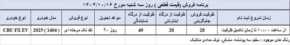 شرکت مدیران خودرو شرایط فروش کراس اوور برقی خود را ویژه دی ماه ۱۴۰۴ اعلام کرد. در شرایط فروش کراس اوور برقی مدیران خودرو فونیکس FX برقی به صورت فروش فوق العاده عرضه می شود. مدت زمان اعلامی برای تحویل این خودرو در این شرایط فروش تحویل ۹۰ روزه است. عرضه این خودرو به صورت فروش نقدی و با قیمت قطعی انجام می شود. پرداخت در این شرایط فروش دو مرحله ای انجام می شود و ۵۰ درصد در زمان ثبت نام و الباقی طی یک فقره چک بدون بهره ۱ ماه پرداخت می شود.