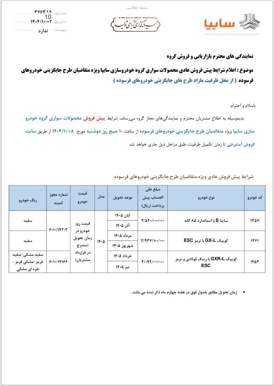 در این شرایط فروش سه محصول شرکت سایپا شامل ساینا S با موعد تحویل آبان و آذر ۱۴۰۵، کوییک GX-L با موعد تحویل مرداد و شهریور ۱۴۰۵ و کوییک GXR-L با موعد تحویل خرداد و تیر ۱۴۰۵ اعلام شده است. لازم به ذکر است که مبلغ پیش پرداخت برای ساینا اس ۲۵۲,۰۰۰,۰۰۰ تومان، کوییک GX-L 293,710,000 تومان و برای کوییک GXR-L 309,200,000 تومان خواهد بود و قیمت تمام شده نیز همان قیمت روز خودرو در زمان تحویل خواهد بود.