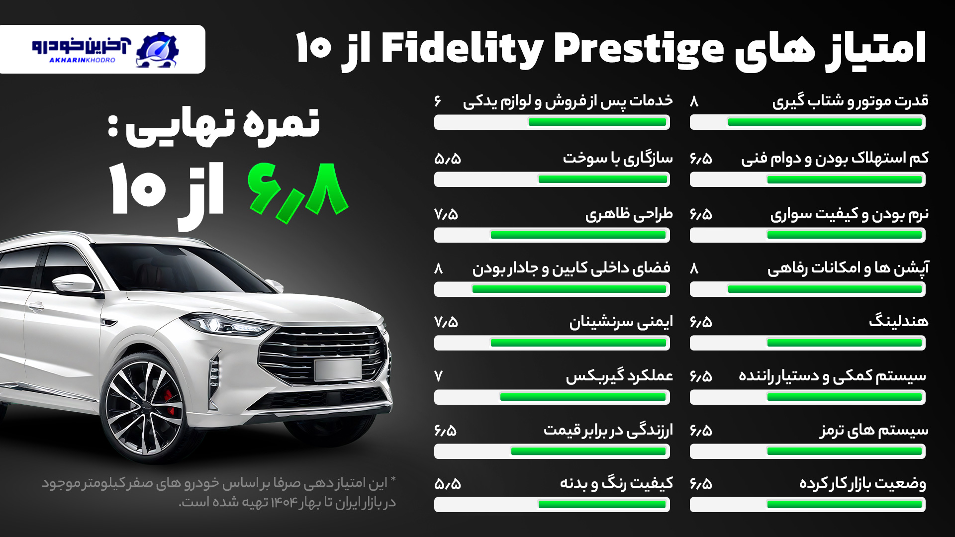 فیدلیتی پرستیژ با نمرهٔ نهایی ۶.۸ از ۱۰، خودرویی با طراحی مدرن، امکانات رفاهی کامل، عملکرد فنی قابل قبول و مناسب برای خانواده‌هایی است که در جستجوی یک کراس‌اوور شهری با چهره‌ای لوکس و لیست بلندبالایی از آپشن‌ها هستند. البته در برخی زمینه‌ها مانند سازگاری با سوخت، گستردگی خدمات پس از فروش و هندلینگ هنوز جای پیشرفت دارد، اما در مجموع می‌توان آن را یکی از گزینه‌های شاخص بازار در بازه قیمتی خود دانست.