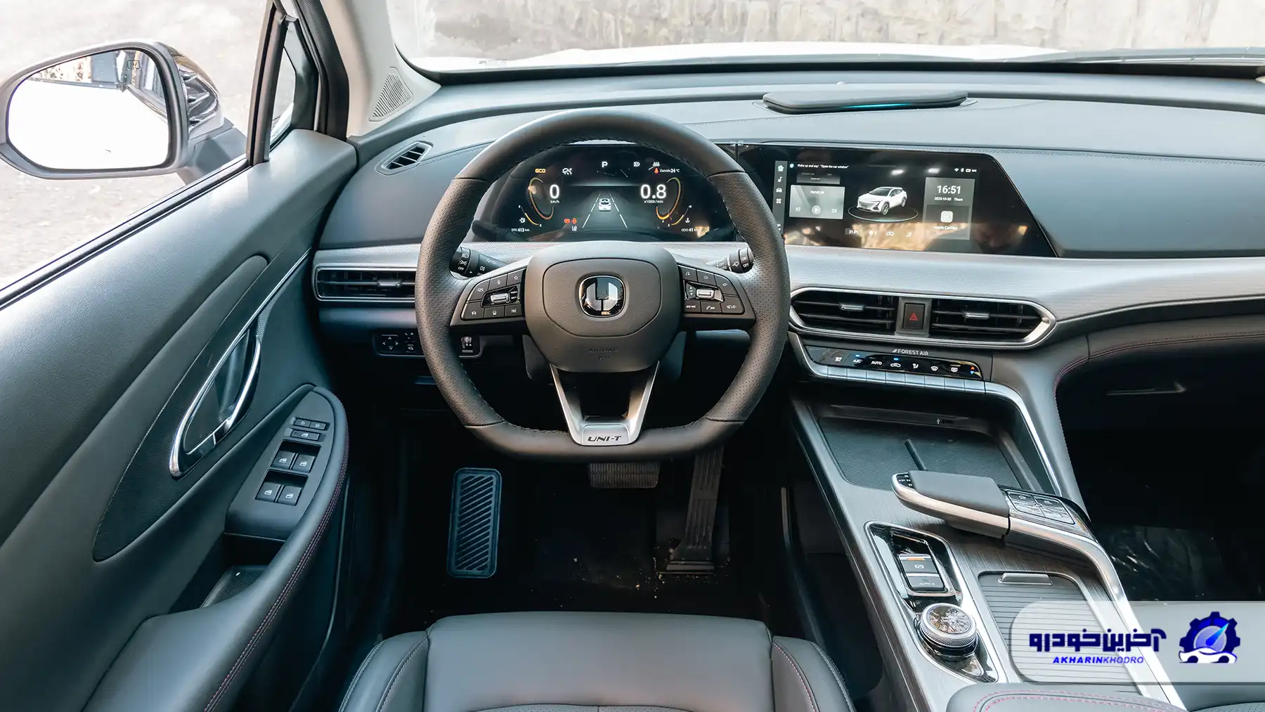 در نگاه نخست، داشبورد چانگان یونی T با فرم خاص و زاویه دارش توجه را جلب می کند. نمایشگر دوگانه با زاویه ای رو به راننده نصب شده و همان ابتدا حس تسلط و تمرکز بر رانندگی را منتقل می کند. طراحی این بخش تا حدی یادآور خودروهای آلمانی است، با این تفاوت که چانگان تلاش کرده زبان طراحی خودش را حفظ کند و از شلوغی بی مورد دوری کند. استفاده از نورپردازی (Ambient Light) در امتداد داشبورد و رودریها، حال و هوایی مدرن و جوان پسند را به کابین داده است.