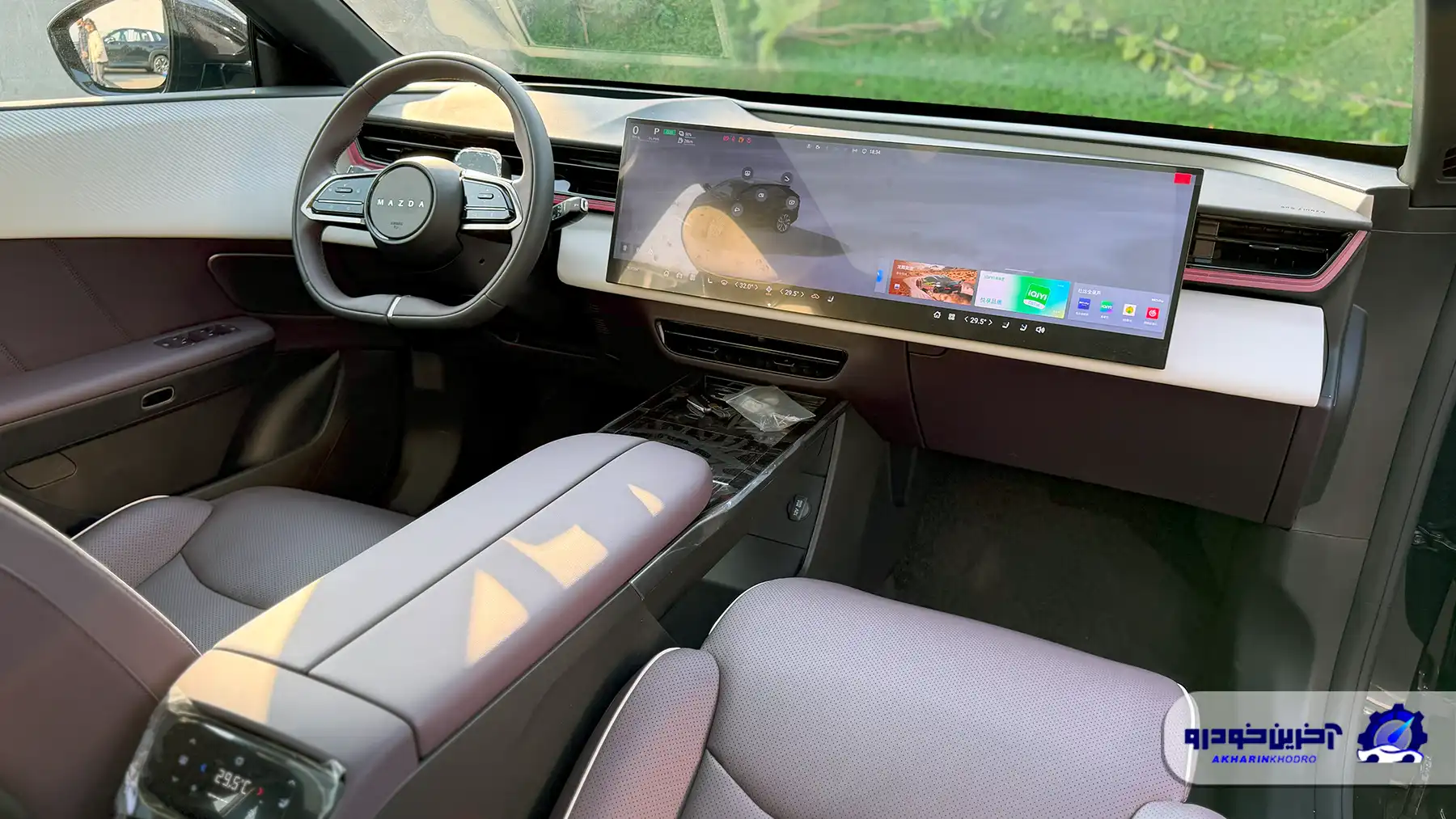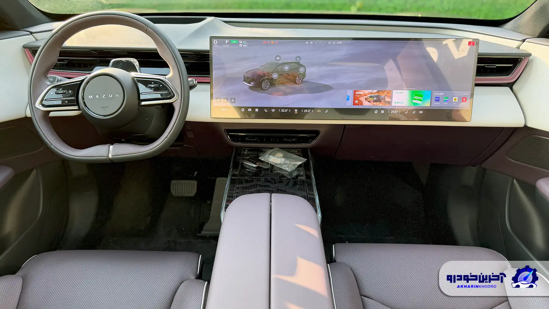 طراحی کابین این خودرو همانند اکثر خودروهای جدید که برقی و هیبرید هستند بسیار مینی مال و ساده است و هیچ شلوغ کاری در آن دیده نمی شود. کابین در این خودرو به سبک خودرو های چینی کاملا مانیتور محور است و مانیتور ۲۶ اینچ باکیفیت 5K است. نبود کلاستر در این خودرو شاید برای بسیاری تعجب بر انگیز باشد اما دلیل اصلی آن به وجود هداپ دیسپلی آن بر می گردد که تمامی اطلاعات مورد نیاز را به صورت سه بعدی برای راننده نشان می دهد. مزدا برای یکی از مدرن ترین محصولات خود در فول ترین تیپ های آن از دوربین به عنوان آینه استفاده کرده و مانیتور های آینه در سمت چپ و راست داشبورد قرار گرفته اند و به نوعی جایی نمایی شده اند که راننده دید راحتی نسبت به آن داشته باشد.