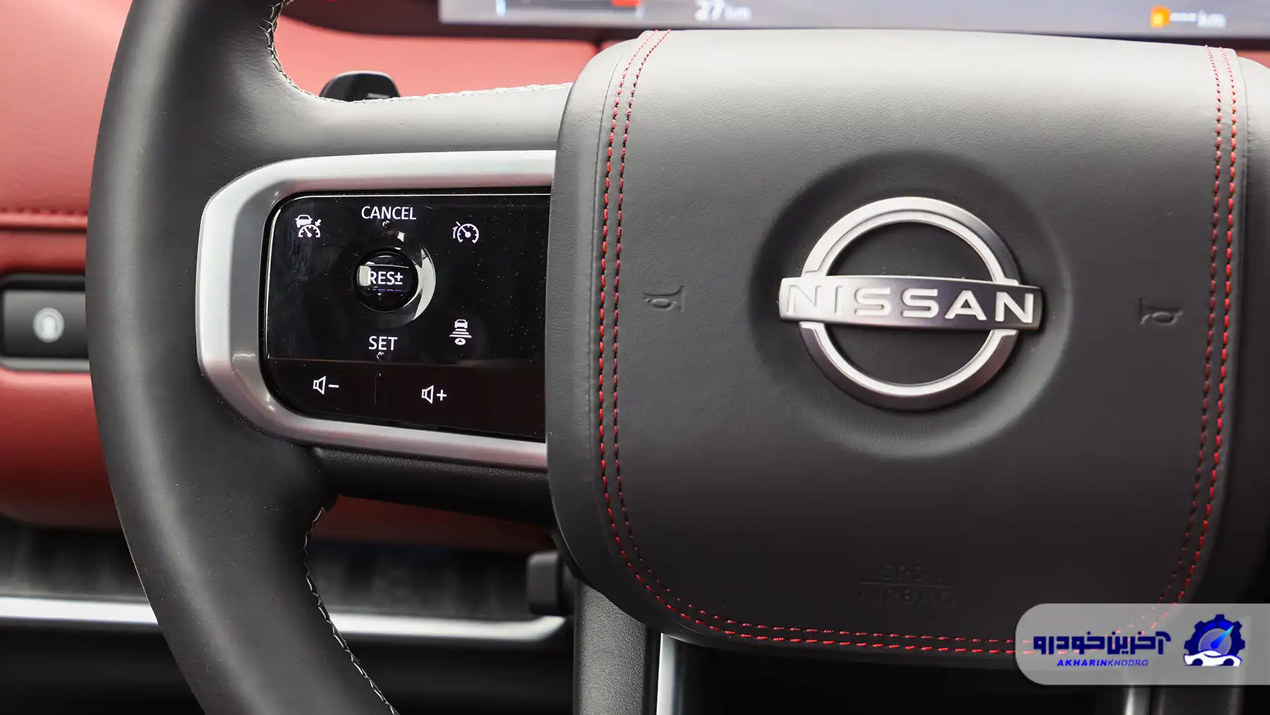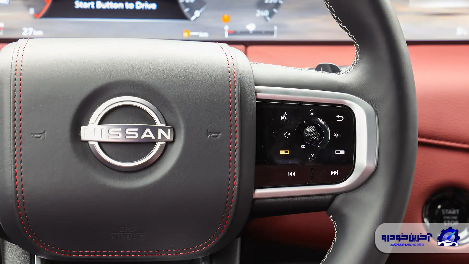 غربیلک فرمان طراحی نسبتاً ساده اما خوشدستی دارد. فرم چهارشاخه با دکمههای کنترلی متعدد، کاربری آسانی فراهم میکند و روکش چرمی آن حس کیفیت را تقویت میکند. طراحی آن بیشتر بر ارگونومی تمرکز دارد تا جلوههای تزئینی؛ موضوعی که با شخصیت کلی پاترول همخوانی دارد.