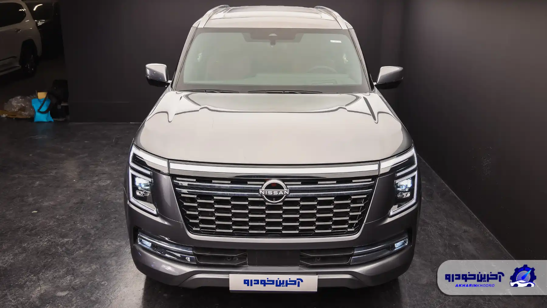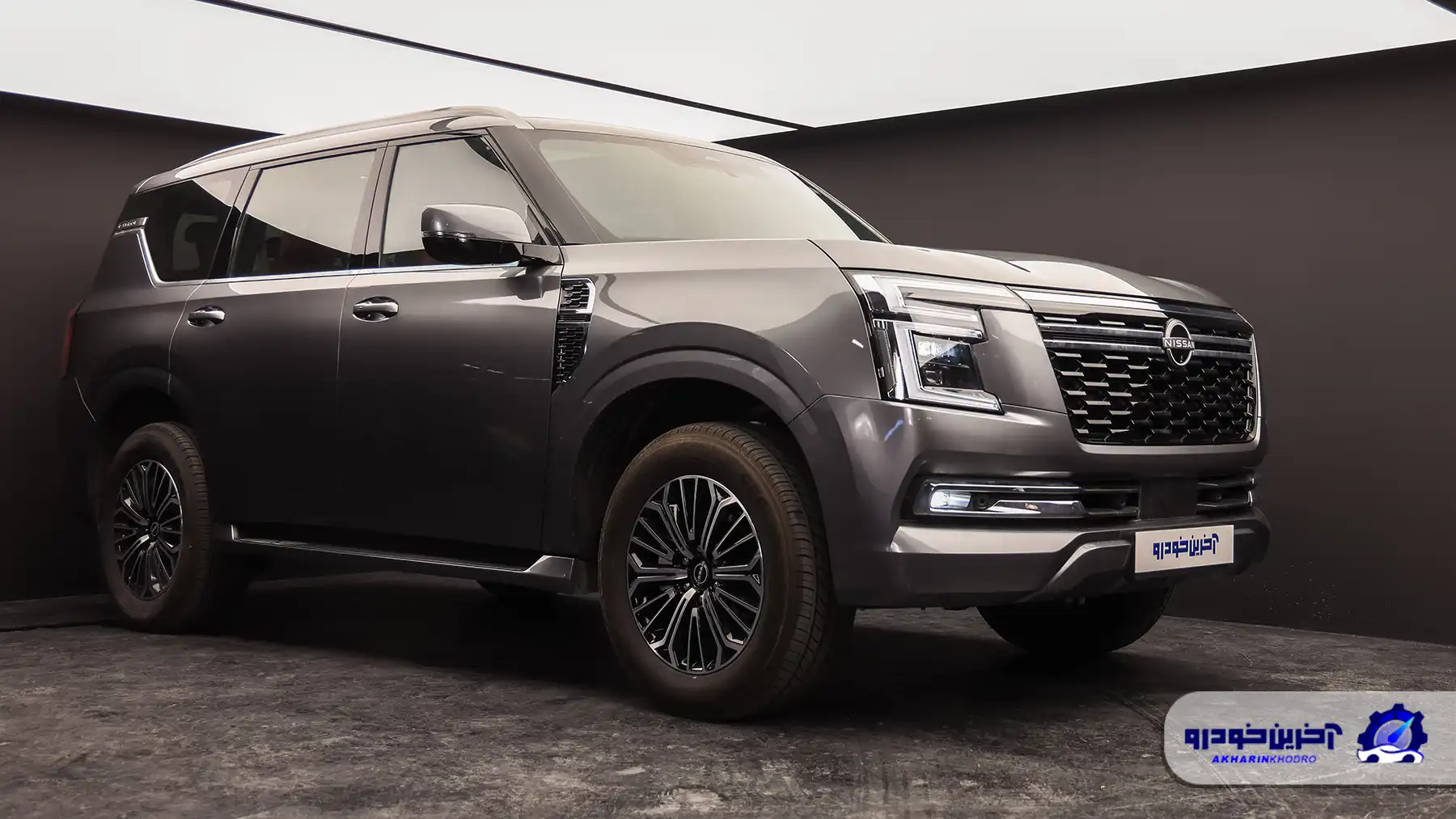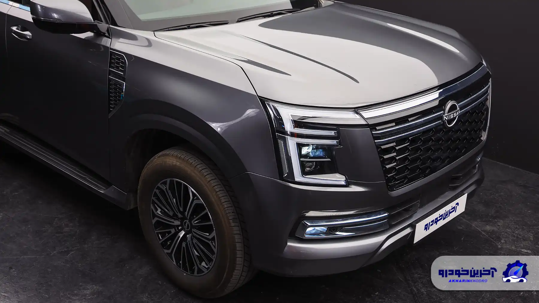 در نمای جلو نیسان پاترول (Y63)، جلوپنجره بزرگ با خطوط افقی ضخیم و قاب کرومی، امضای بصری اصلی خودرو را شکل میدهد. چراغهای LED با گرافیک نسبتاً ساده اما دقیق، چهرهای جدی و باوقار به خودرو دادهاند. طراحی سپر جلو با ورودیهای هوای بزرگ و بخش زیرین برجسته، نهتنها جلوهای خشنتر ایجاد کرده، بلکه با توجه به ماهیت آفرودی خودرو، کاربردی هم هست. زاویه ورود مناسب پاترول نشان میدهد که طراحان صرفاً به ظاهر اکتفا نکردهاند؛ این زاویه در سطحی رقابتی با لندکروزر ۳۰۰ قرار میگیرد و برای یک SUV فولسایز لوکس، عدد قابل قبولی محسوب میشود، هرچند در برخی تیپها به دلیل طراحی سپر، اندکی محافظهکارانهتر از رقیب ژاپنیاش است.