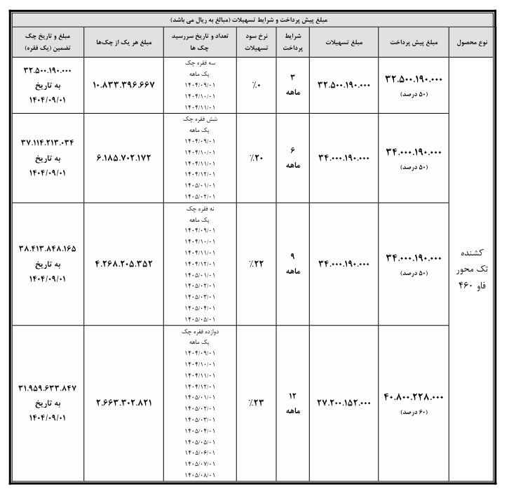 شرکت سیبا موتور شرایط فروش نقدی–اعتباری محصولات سنگین خود را ویژه نیمه دوم شهریور ماه اعلام کرده است. ثبتنام این طرح از ساعت ۱۱ صبح سهشنبه ۲۵ شهریورماه ۱۴۰۴ آغاز شده و تا ساعت ۱۶ روز دوشنبه ۳۱ شهریورماه ۱۴۰۴ یا تا تکمیل ظرفیت ادامه خواهد داشت. فرآیند خرید از درگاه عاملیت های مجاز سیبا موتور انجام میشود و تکمیل مراحل در سامانه به منزله انعقاد قرارداد قطعی با شرکت خواهد بود.