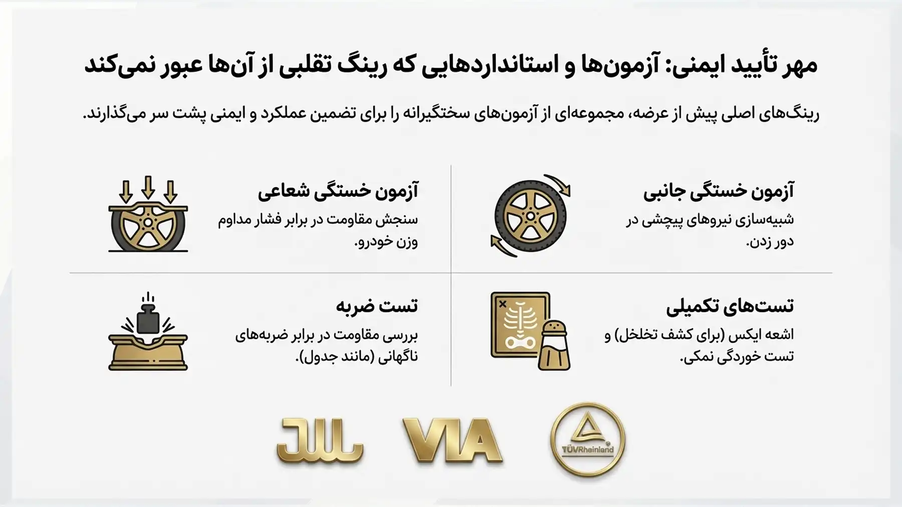 استانداردهای شناخته شده جهانی در این زمینه شامل JWL و VIA (ژاپن)، TÜV Rheinland (آلمان) و SAE J2530 (آمریکا) هستند. این گواهی‌ها فقط در صورت گذر موفق از تمامی مراحل آزمایش صادر می‌شوند. در مقابل، رینگ‌های تقلبی معمولاً هیچ‌کدام از این مراحل را طی نمی‌کنند یا تنها ظاهر علامت استاندارد را تقلید می‌کنند.