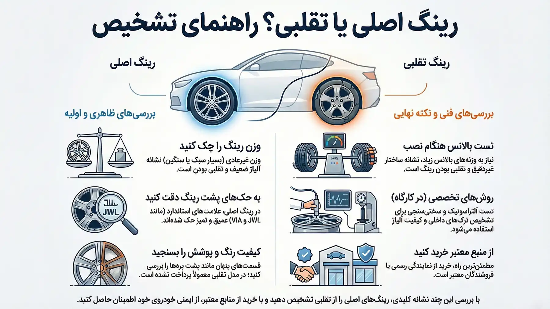 برای تشخیص رینگ اصلی از تقلبی چند معیار ساده اما دقیق وجود دارد. نخست، وزن رینگ را بررسی کنید؛ وزن غیرعادی نشانه ترکیب فلزی ضعیف است. دوم، به محل حک‌های پشت رینگ توجه کنید. در مدل‌های اصلی، علامت‌ها مانند JWL و VIA با حک عمیق و تمیز مشخص‌اند، درحالی‌که در نمونه‌های فیک معمولاً سطحی یا چاپی‌اند. سوم، رنگ و پوشش را از قسمت‌های پنهان مانند پشت پره‌ها بررسی کنید، چون در رینگ تقلبی آن بخش‌ها معمولا پرداخت نشده است. چهارم، تعادل چرخ را در اولین نصب بسنجید؛ اگر نیاز به بالانس زیاد دارد، احتمالاً ساختار رینگ غیردقیق است که از نشانه‌های تقلبی بودن رینگ می‌باشد.
