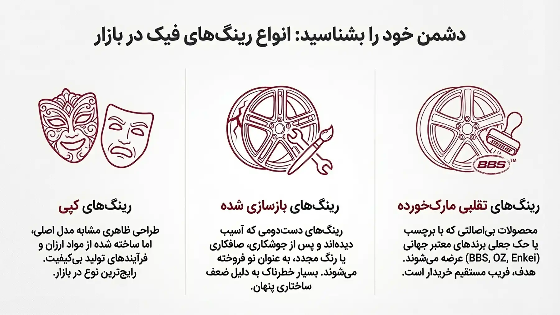 انواع رینگ فیک۱. کپی (Replica): ظاهر مشابه با مواد ارزان. ۲. بازسازی شده (Refurbished): تعمیر و رنگ مجدد. ۳. مارک خورده: چسباندن جعلی برندهای معروف.